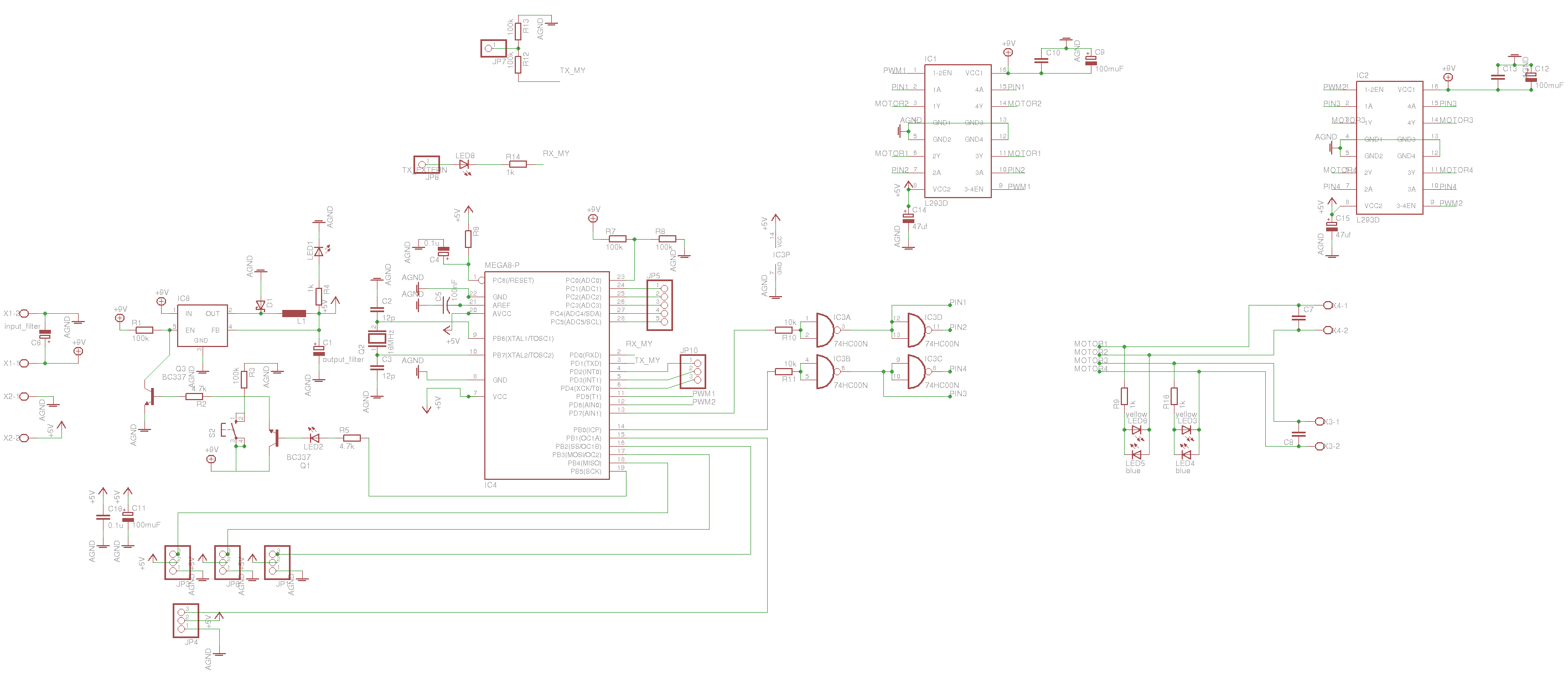 Собрал схему для управления моторами и сервами. Для отладки на ней есть две пары светодиодов которые подключены параллельно с двигателями. Но при запуске моторов почему-то загораются сразу все светодиоды (на схеме они справа внизу, LED 6,5,4,3)