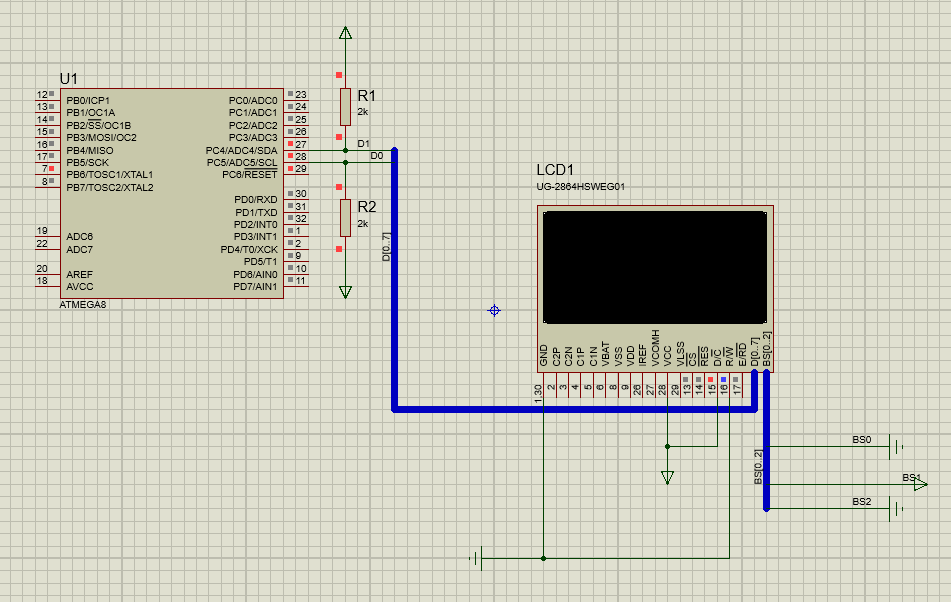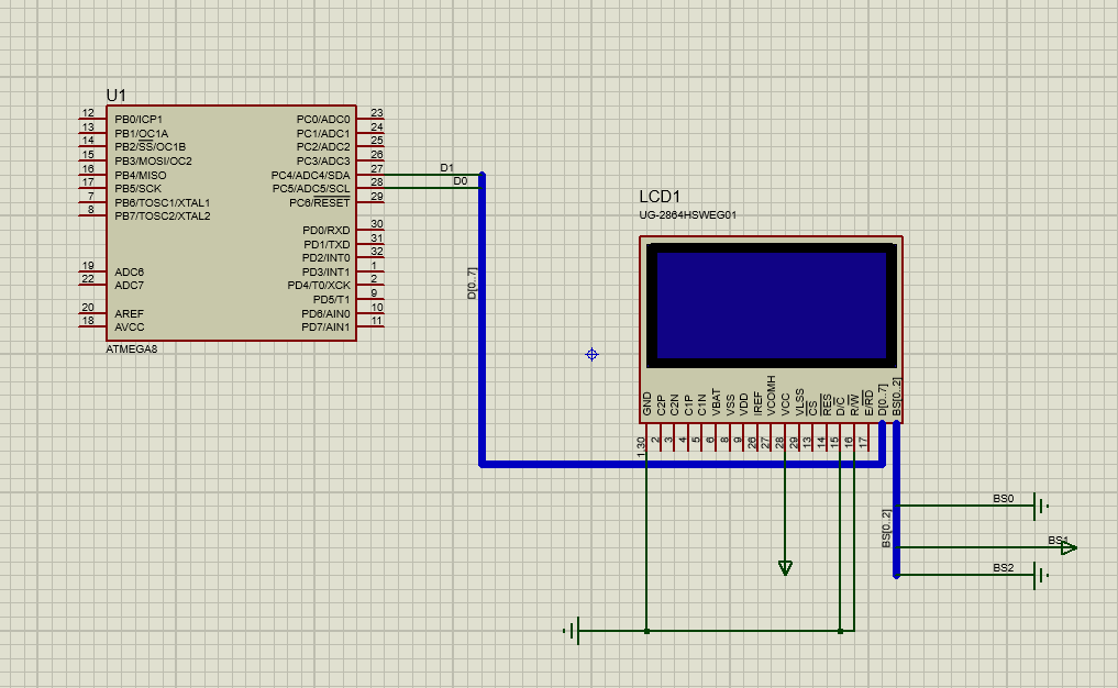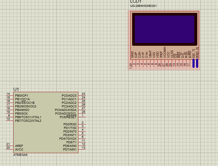 Парни! Помогите пожалуйста подсоеденить в Proteus 8 вот этот дисплей(UG-2864HSWEG01) по i2c шине к Atmega8. Ни как не могу понять как подключать. Вроде как написано в даташите что D1 это SDA, а D0 это SCL. Вот только не понятно как их подключать в Proteus. На месте этих выводов две синие полоски. К сожалению с Proteus я почти не знаком, а проект надо кодить. Заранее ОГРОМНОЕ человеческое спасибо!