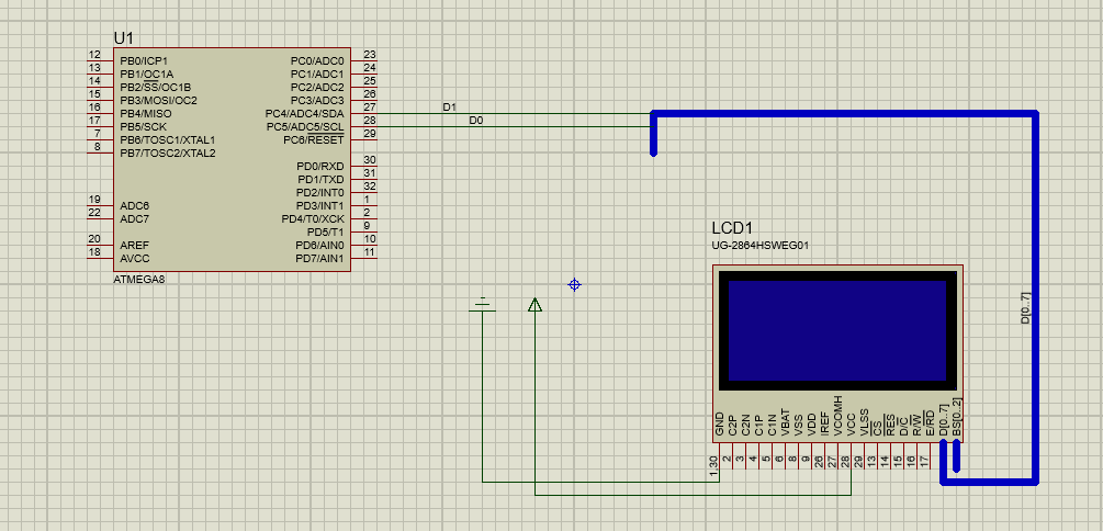Парни! Помогите пожалуйста подсоеденить в Proteus 8 вот этот дисплей(UG-2864HSWEG01) по i2c шине к Atmega8. Ни как не могу понять как подключать. Вроде как написано в даташите что D1 это SDA, а D0 это SCL. Вот только не понятно как их подключать в Proteus. На месте этих выводов две синие полоски. К сожалению с Proteus я почти не знаком, а проект надо кодить. Заранее ОГРОМНОЕ человеческое спасибо!