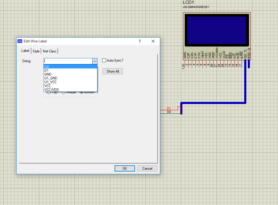Для того, чтобы выводы дисплея появились в списке, шине, которую вы пририсовали вручную к шине дисплея, надо тоже присвоить имя, например "D", при помощи "Place Wire Label".