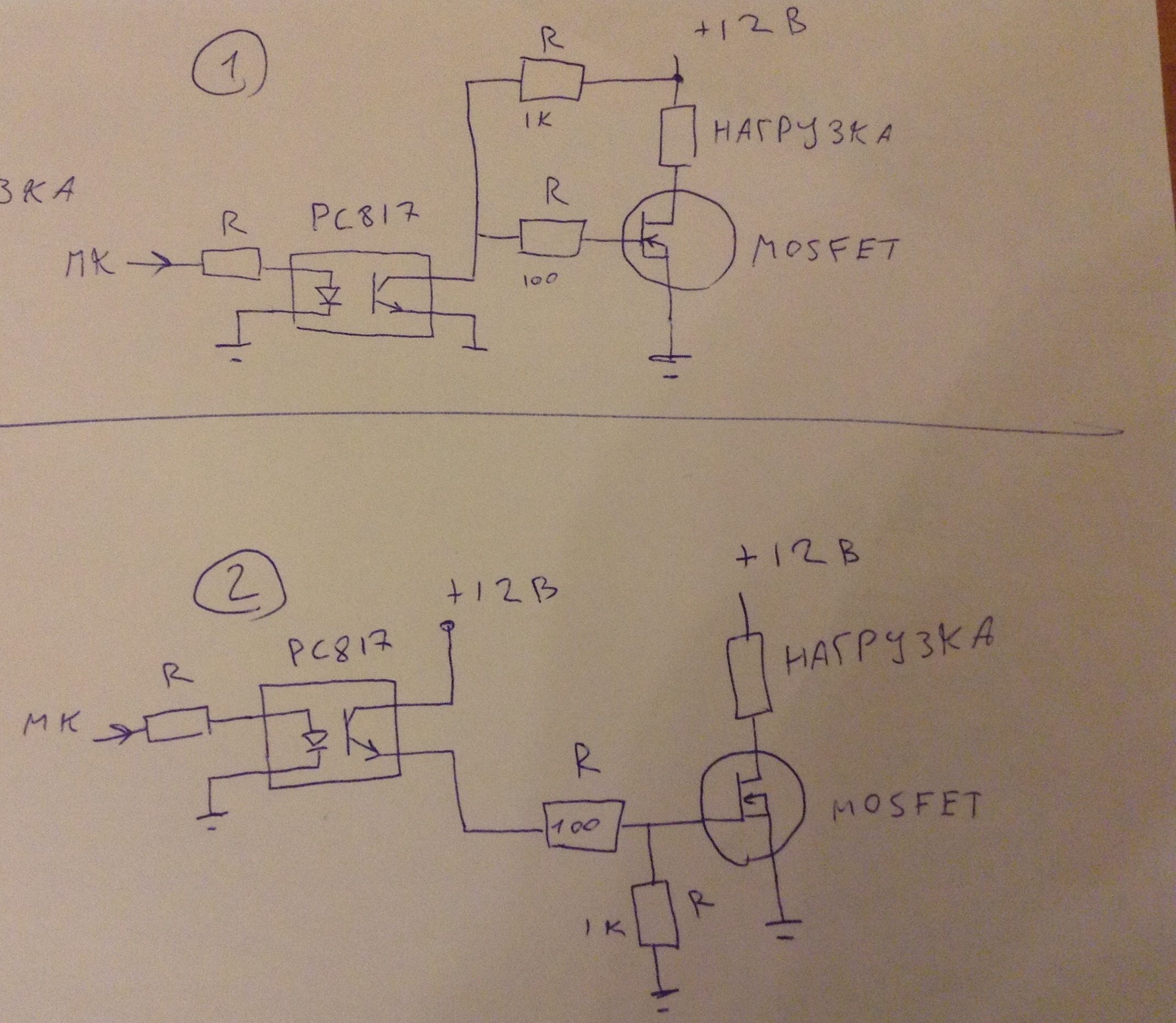1 - нашел в интернете. Но у нее проблема, при отсутствии сигнала от МК - нагрузка включится, т.к. есть подтяжка на +12 у mosfet. А мне хочется этого избежать.