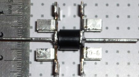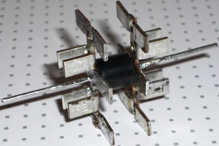 Перемычку разрезал пополам, разогнул несколько площадок для лучшего охлаждения и припаял с обоих торцов диода. Пайка такого большого радиатора далась не с первого раза... поняв что "маломощным" паяльником в 15Вт ничего не выйдет (ну сцуко отводит радиатор тепло сразу от места пайки) пришлось применить 100Вт паяльник. Радиатор зажимал в небольшие тиски, паяльником разогревал весь радиатор в месте припайки к диоду, как только олово нормально растекалось, а не кристаллизовалось по краям - засовывал диод - и быстро поливал всю конструкцию водой. И так с обоих торцов диода. Ножки диода пока оставил, думаю к ним провода припаять в дальнейшем, хотя смысла в ножках наверное нет, ведь можно непосредственно к торцевым радиаторам паять провода.