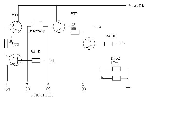 Решил я использовать движковый мост из игрушечного танка (схему привожу ниже). На схеме используется 2 модуля для каждого двигателя. На схеме цифрами указаны выводы ИС TH3L10. Работа драйвера такова: подаешь 1 на in1, 0 на in2 двигатель вращается в одну сторону, 0 на in1, 1 на in2 двигатель вращается в другую сторону. Схема питается от аккумулятора 8 В. В общем суть проблемы: когда я на входы подаю 1 - питание от аккумулятора 8 В, все работает нормально, но когда я входы подключил к выходам минибота (D4 и C2, общий провод минибота тоже подключил к общему платы) в одну сторону двигатель вращается, а в другую сгорает предохранитель на питании 8 В и транзисторы драйвера греются. Ничего не понимаю, вроде бы там всего лишь чередуются 0 и 1, но работает только в одну сторону