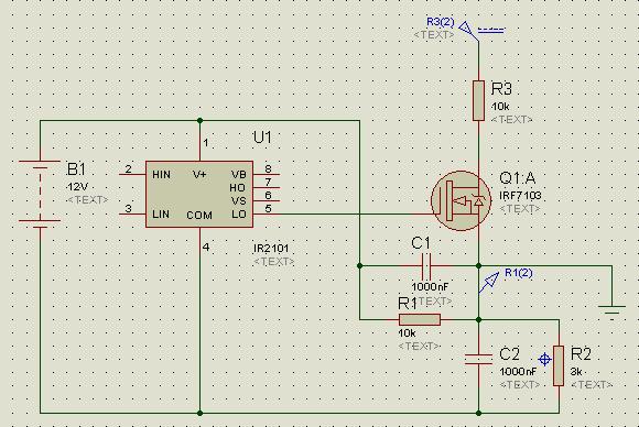протеус не хотит симулировать нормально большие куски и драйвер тот же IR2110... сигнал на затвор диет с драйвера, любого... вся фишка в том чтобы исток полевика подключить через кондеры к общему проводу драйвера и к питанию драйвера. получается как в полумостовом преобразователе.....