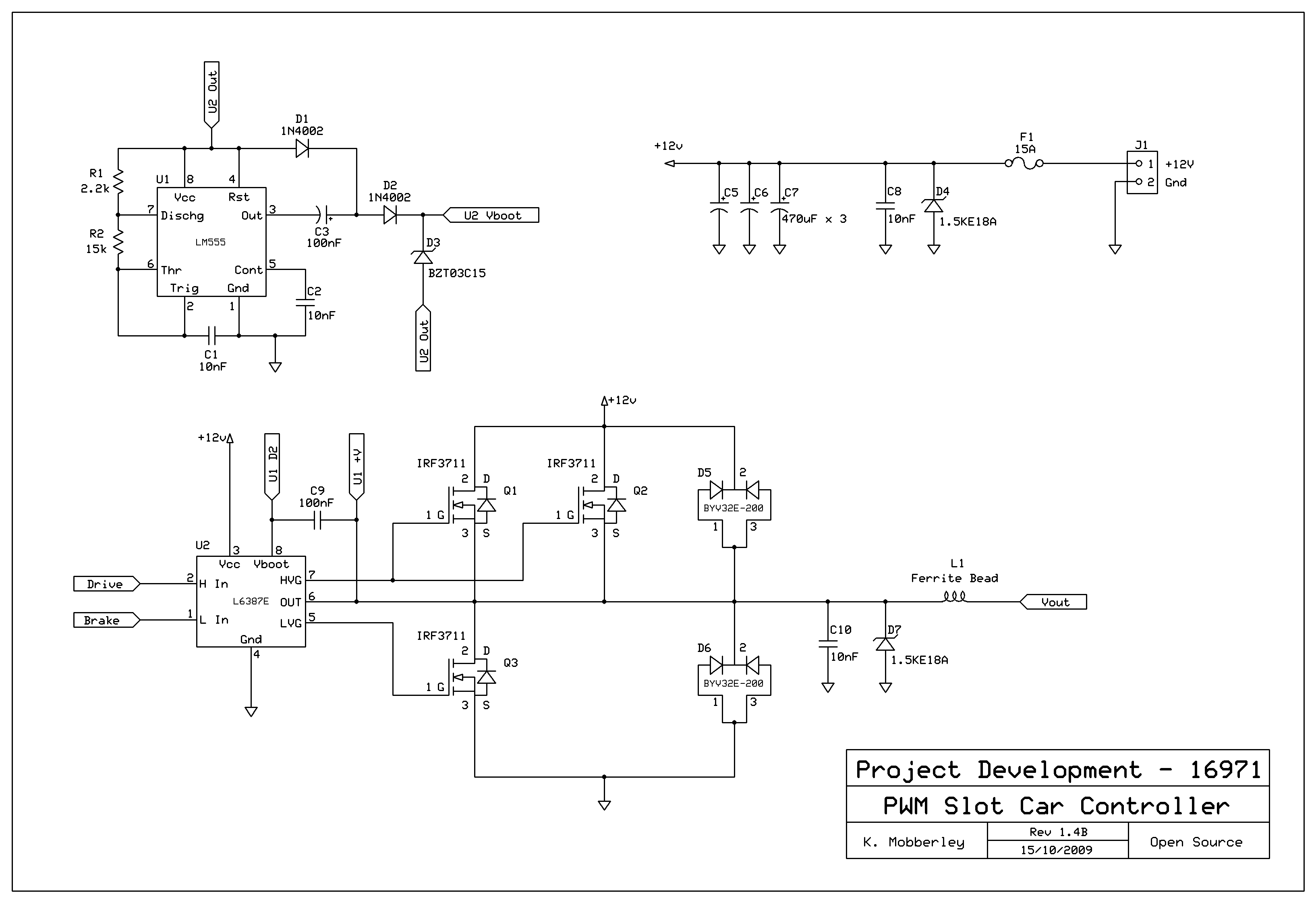 Когда транзистор (IGBT) выключен, конденсатор накачки заряжается через диод 11DF6 и нагрузочный (load) резистор. Когда транзистор включен, 100k резистор соединенный с общей шиной заряжает 100nF конденсатор додсоединенный к контактам 1 (GND) и 8 (V+) таймера , генерируя -15в относительно вывода 5 (VS) драйвера. Цепь накачки состоит из двух диодов 1N4148 и конденсатора 10nF, которые преобразуют 7.5kHz прямоугольные импульсы на вывод 3 (OUT) таймера в +15в относительно VS и заряжают конденсатор.