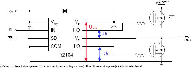 Диаграмма показывает изменения сигналов при старте. По включении транзистор, диод накачки отключает контакт 8 (VB) драйвера от питания +12в и напряжение начинает падать через конденсатор накачки (100nF). В это же время 100k резистор подключенный между выводами 1 (GND) таймера и общей шиной начинает заряжать подключенный к нему 100nF конденсатор и генерировать напряжение питания для микросхемы таймера. Напряжение на выходе цепи накачки увеличивается с увеличением напряжения питания (таймера). Цепь накачки поддерживает напряжение на конденсаторе накачки, поддерживая напряжение выше, чем напряжение нижнего порогового напряжения драйвера.