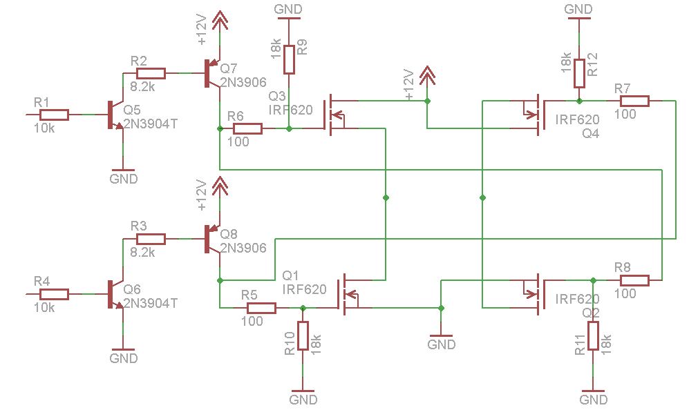 Добрый день. Прошу совета по н-мосту на N Mosfet'ах. Из Mosfet'ов у нас в магазинах есть только irf730, irf820. Заказывать дорого, мне нужно всего один мост собрать как можно дешевле и без наворотов. Параметры: ток 2А, напряжение 24В. Долго искал схему только на N mosfet'ах, и вот, что нашел. Транзисторы там были 2n3904, 2n3906, я их заменил на кт3102, кт3107.