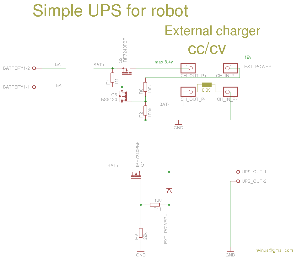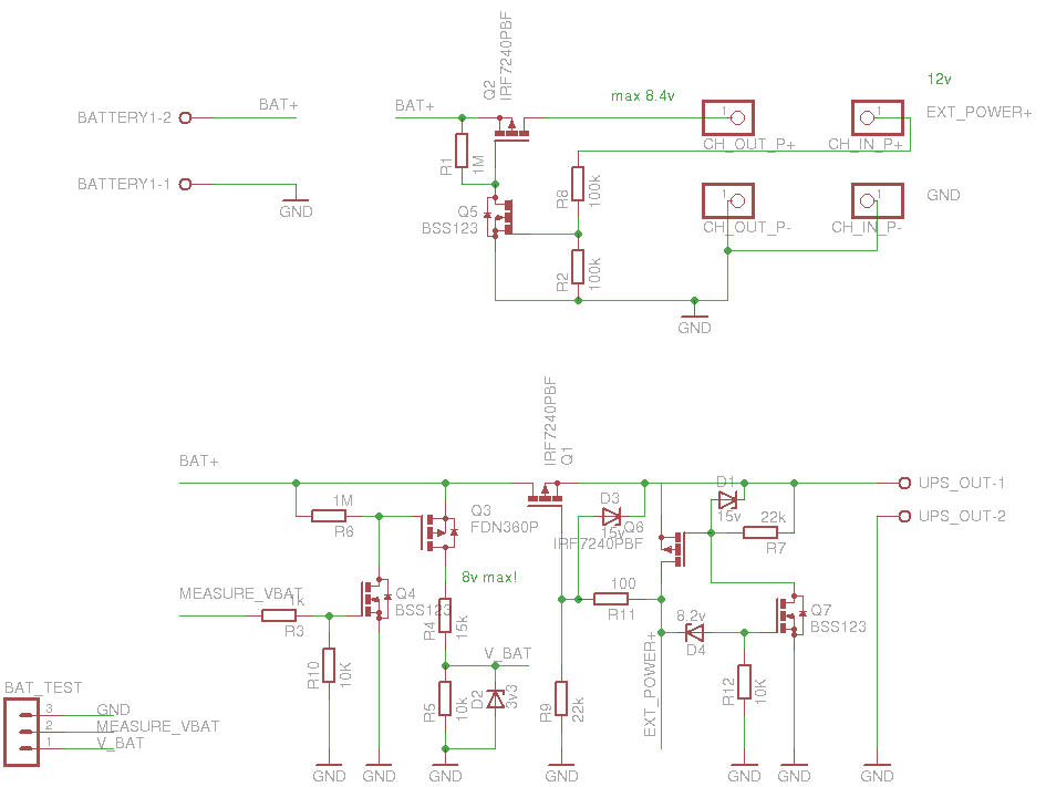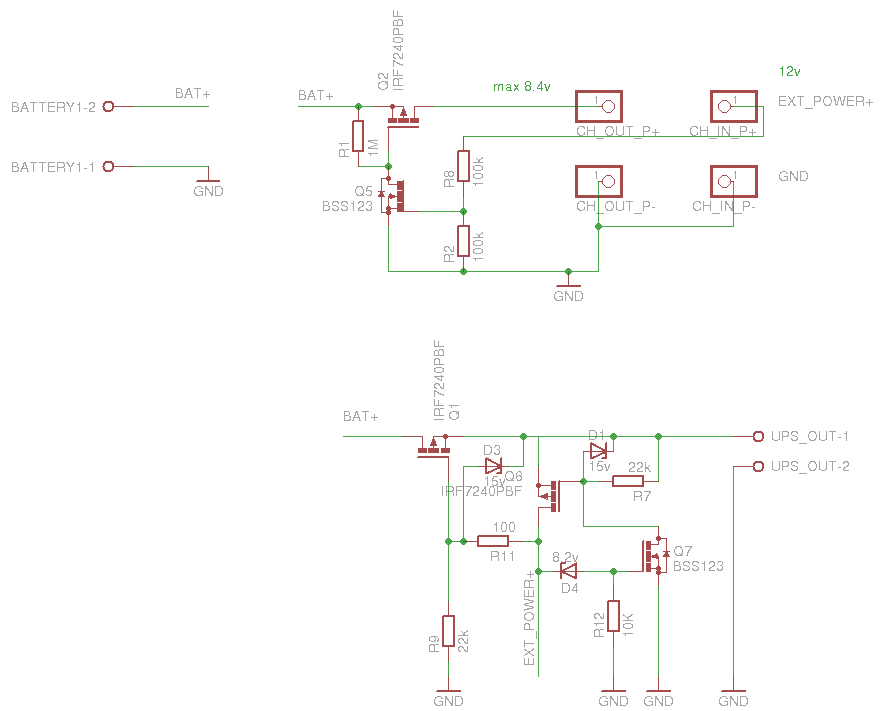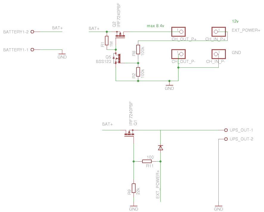 Добавлено спустя 10 минут 19 секунд:Кстати, если EXT_POWER менее 8в (проверял на 4в), то батарея всё равно отключается от нагрузки, просто не будет идти заряд, питание на UPS_OUT-1 будет идти через встроенный в Q6 диод, естественно с падением напряжения на нём.