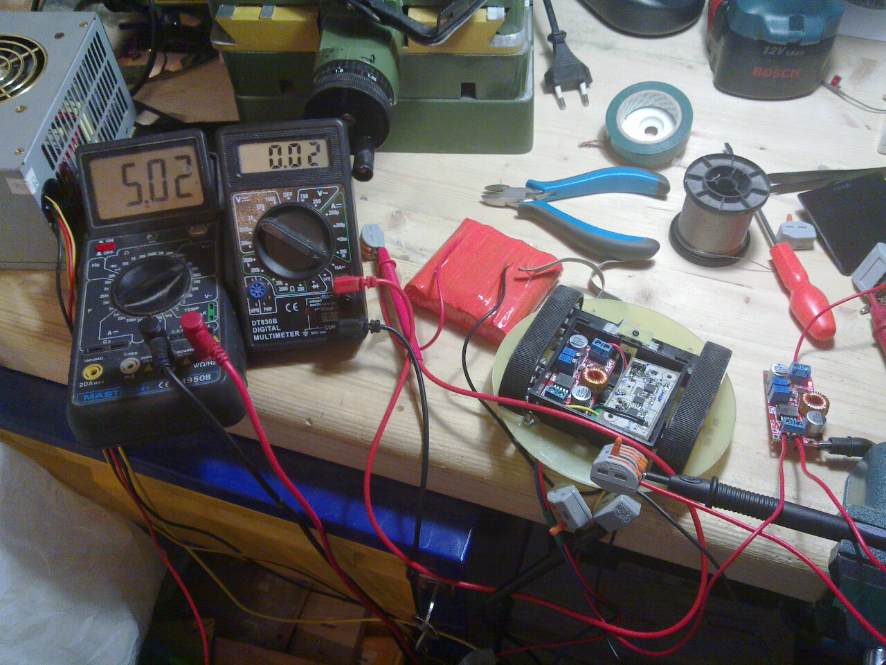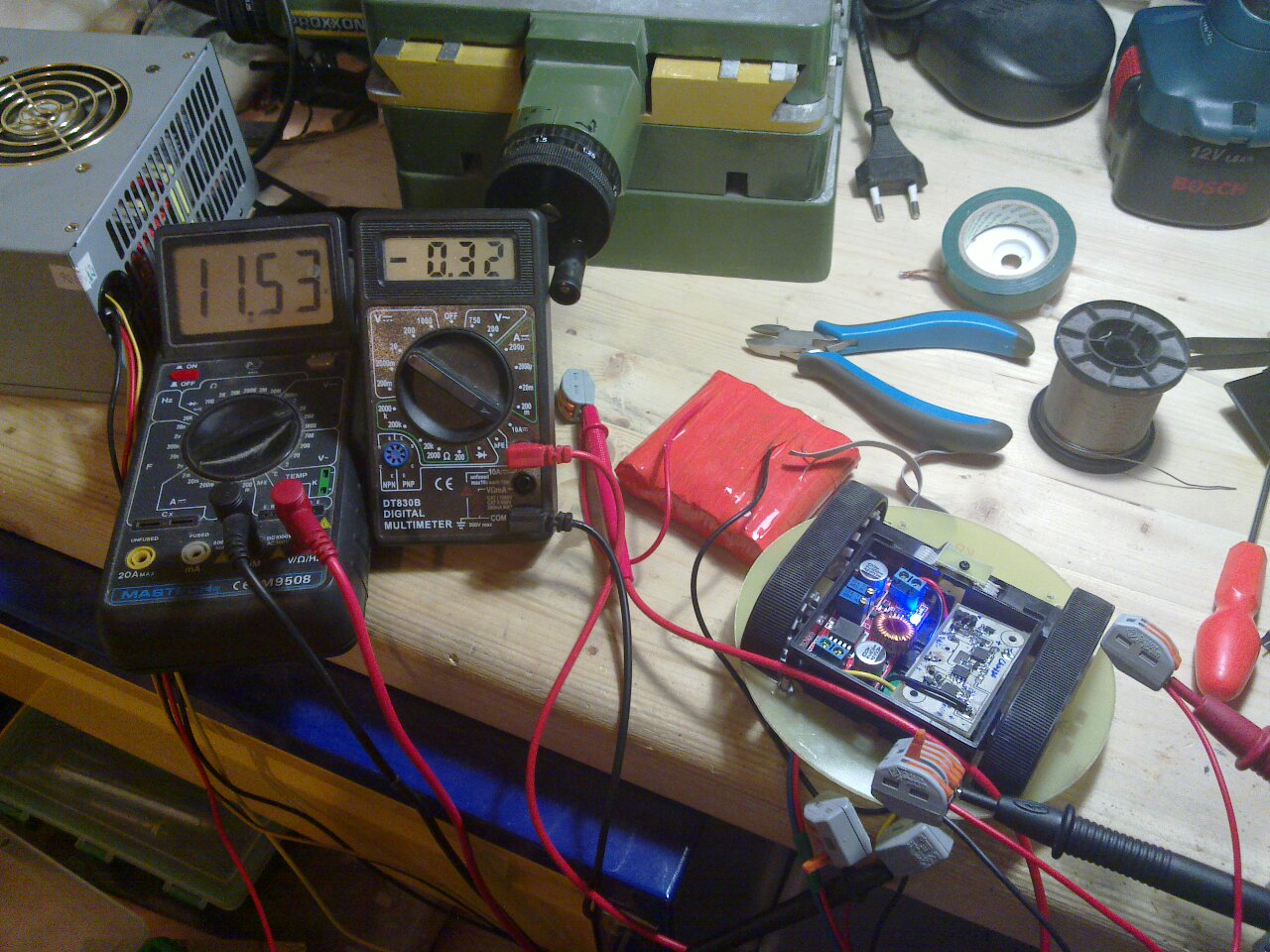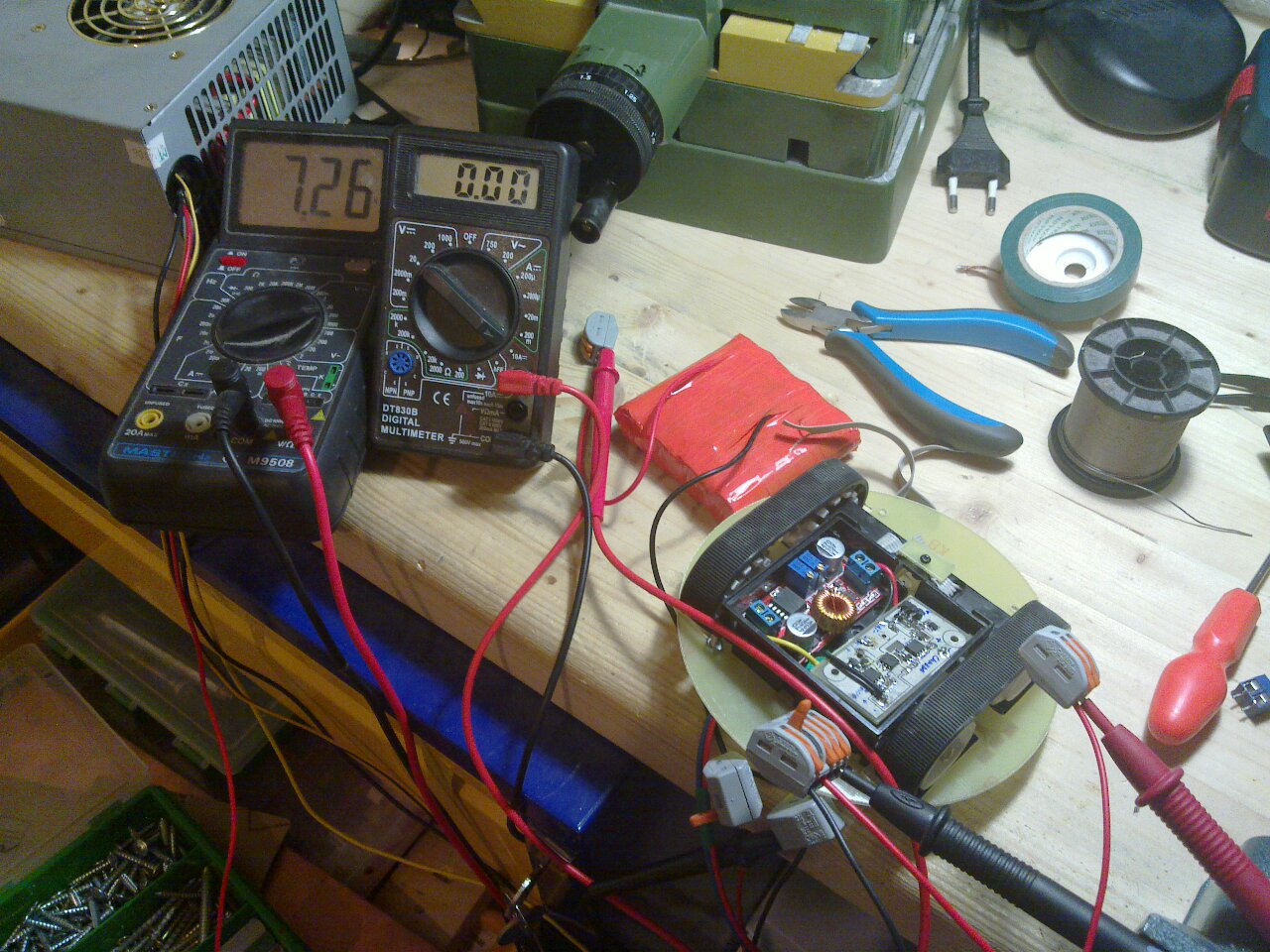Там же будет плата защиты аккумулятора (красная плата лежит в левом верхнем углу на столе)