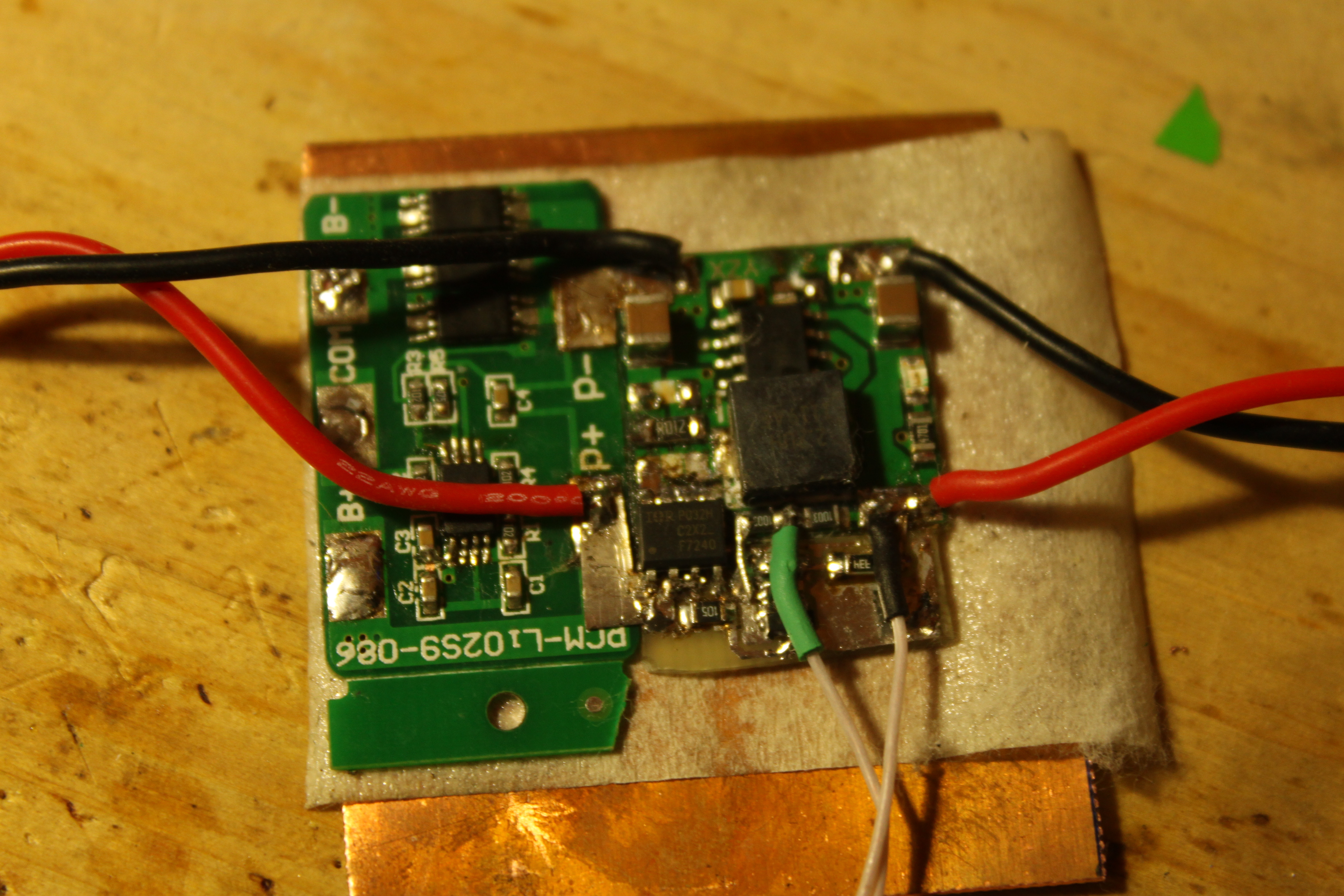 Сделал медный радиатор (припаян снизу), заменил диод полевым транзисором получилось так, это PCM + charger