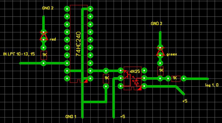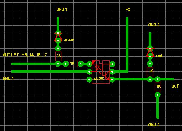 Вот схема для развязки линий LPT out. Может что не правильно? У меня есть сомнения в номиналах резисторов, т. к. в левой части получается делитель и нужно ли развязывать земли?