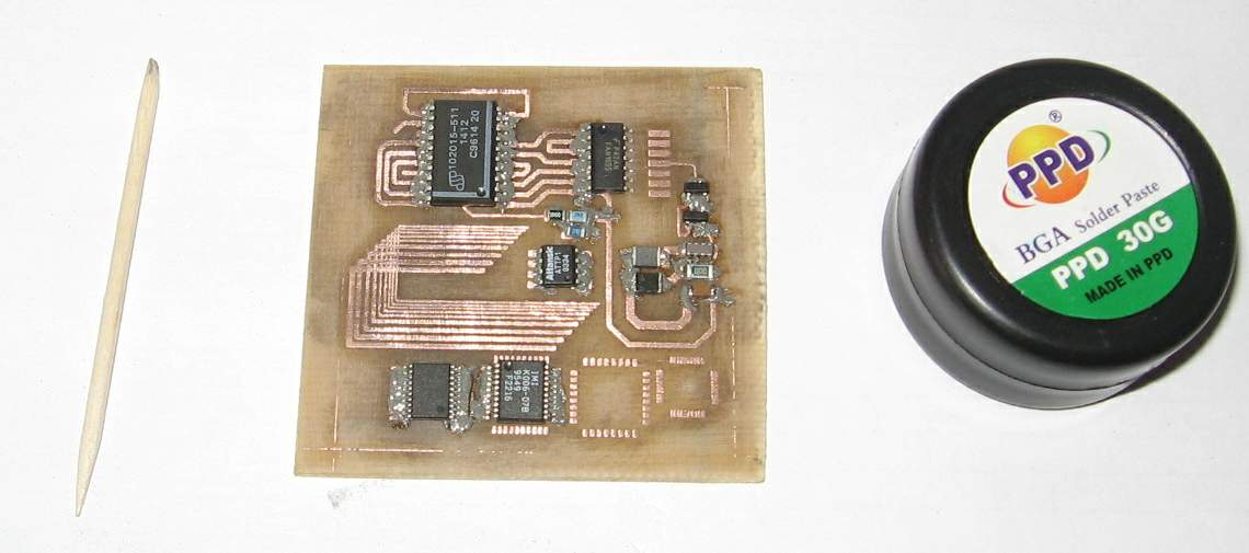 из шприца сделан дозатор, паяльная паста разогрета и всосана шприцом. (иглу желательно по толще, эта 0,3-0,4 мм, плохо выдавливать пасту, выдавил чуток а она еще лезет и лезет по инерции)