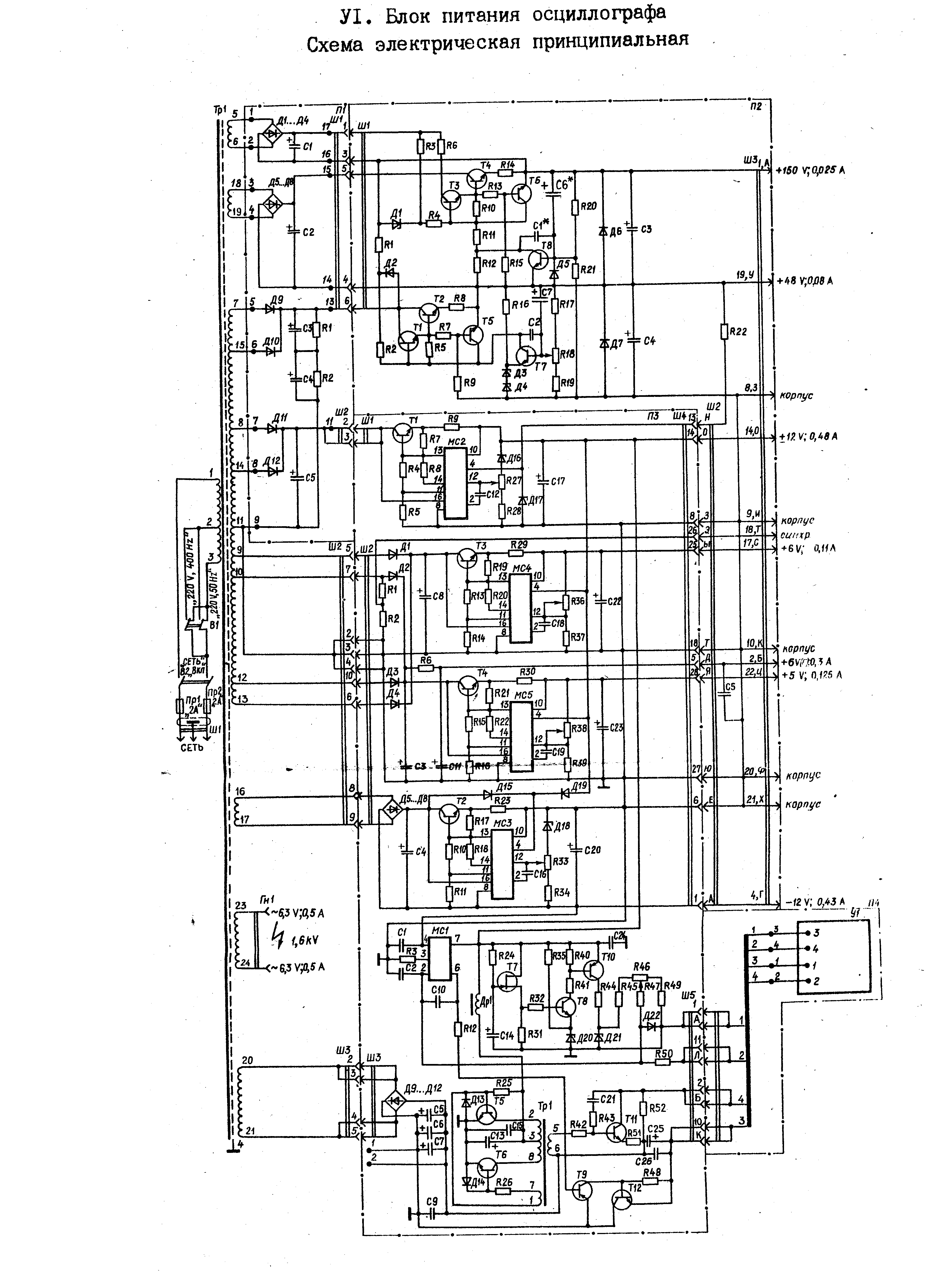 У меня там дико греются транзисторы Т11 и Т12 (см. схему) и получается какой-то очень кривой сигнал. А на выходе высоковольтника 1,5 кВ вместо четырех по паспорту. (конечно может его так сажает сопротивление мультиметра) Непонятно кто погорел: умножитель или транзисторы, которые его питают. Осцил хранили в ужасных условиях и внутри там все закисло. Проработал он всего пару часов, потом упала яркость, а вскоре и вообще пропал луч.