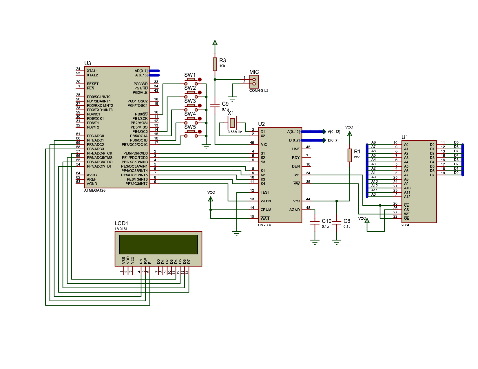 HM2007 САМА работает с памятью. У нее есть шины адреса и данных, а также линии управления -- все это подключается к ОЗУ. Контроллер общается с микросхемой по ОТДЕЛЬНОЙ шине. И он понятия не имеет, что и по какому адресу МС пишет в ОЗУ. Можно рассматривать связку HM2007+ОЗУ как черный ящик. Говорим микросхеме "запиши шаблон команды №1", и начинаем проверять статус микросхемы. Когда она обнаружит, что с микрофона поступил сигнал, она запишет сэмплы в ОЗУ, потом на их основы построит некий шаблон для распознавания, и запишет его в ОЗУ, потом установит статус "готово". Контроллер может отправлять следующую команду. После того, как голосовая команда записана, говорим "хочу получить шаблон команды №1". Она в ответ : "данные займут X байт". X раз посылаем команду "читать очередной байт", пишем полученные байты в ПЗУ. Когда в следующий раз включается питание, перегоняем шаблоны в обратном направлении. Есть еще команды "перейти в режим распознавания", "получить результат распознавания", "стереть все шаблоны"