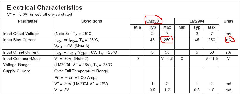 Есть резюки ОС и входные.Ток как видно на фотке 40 мкА входной. В даташите же сказано 250 нА. Я правильно понял что ему прийдет кердык.