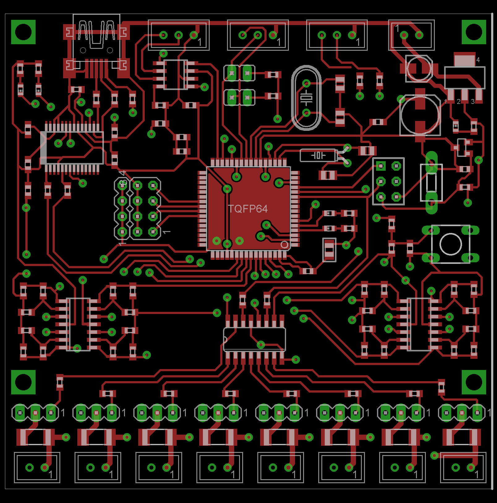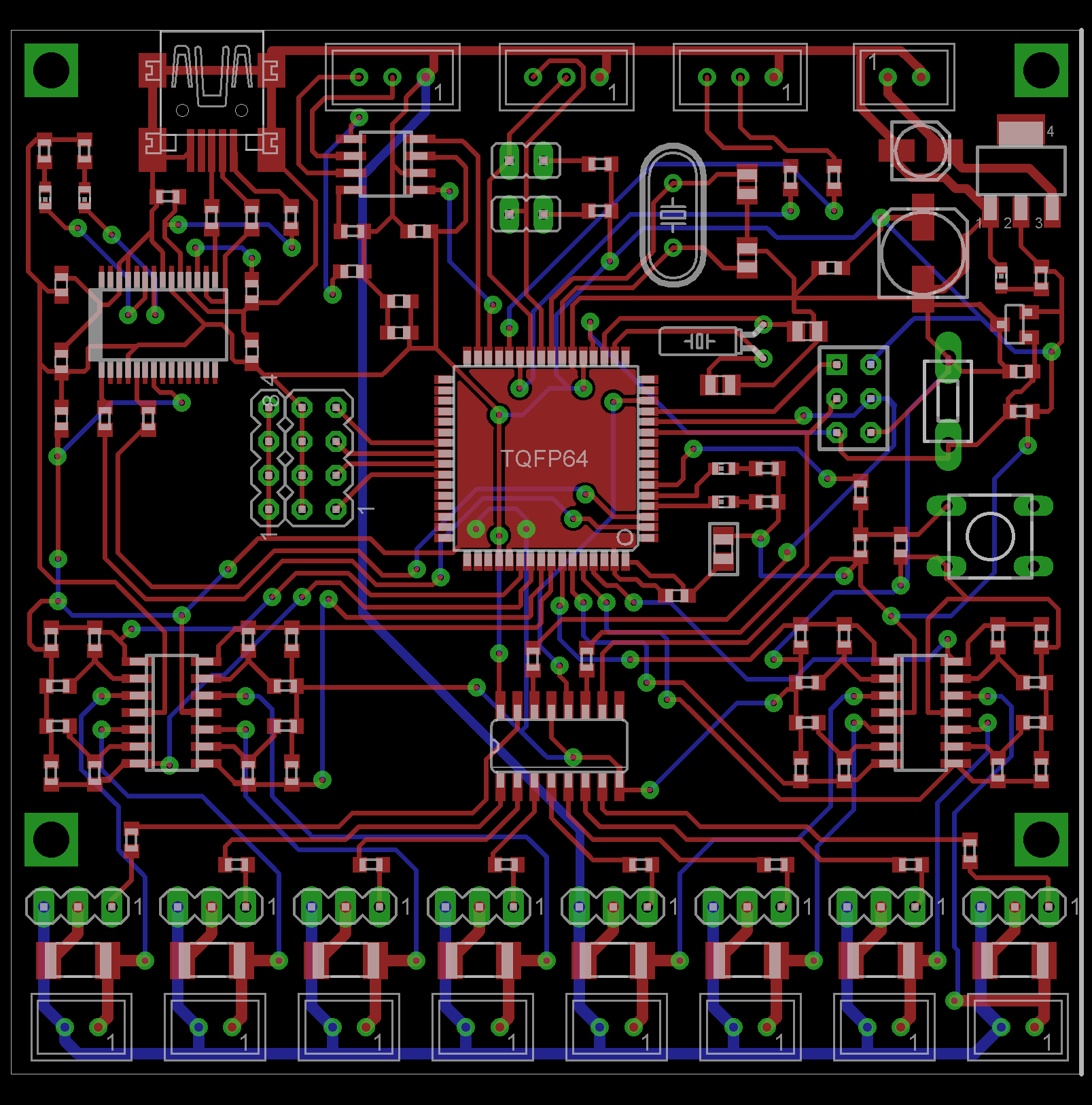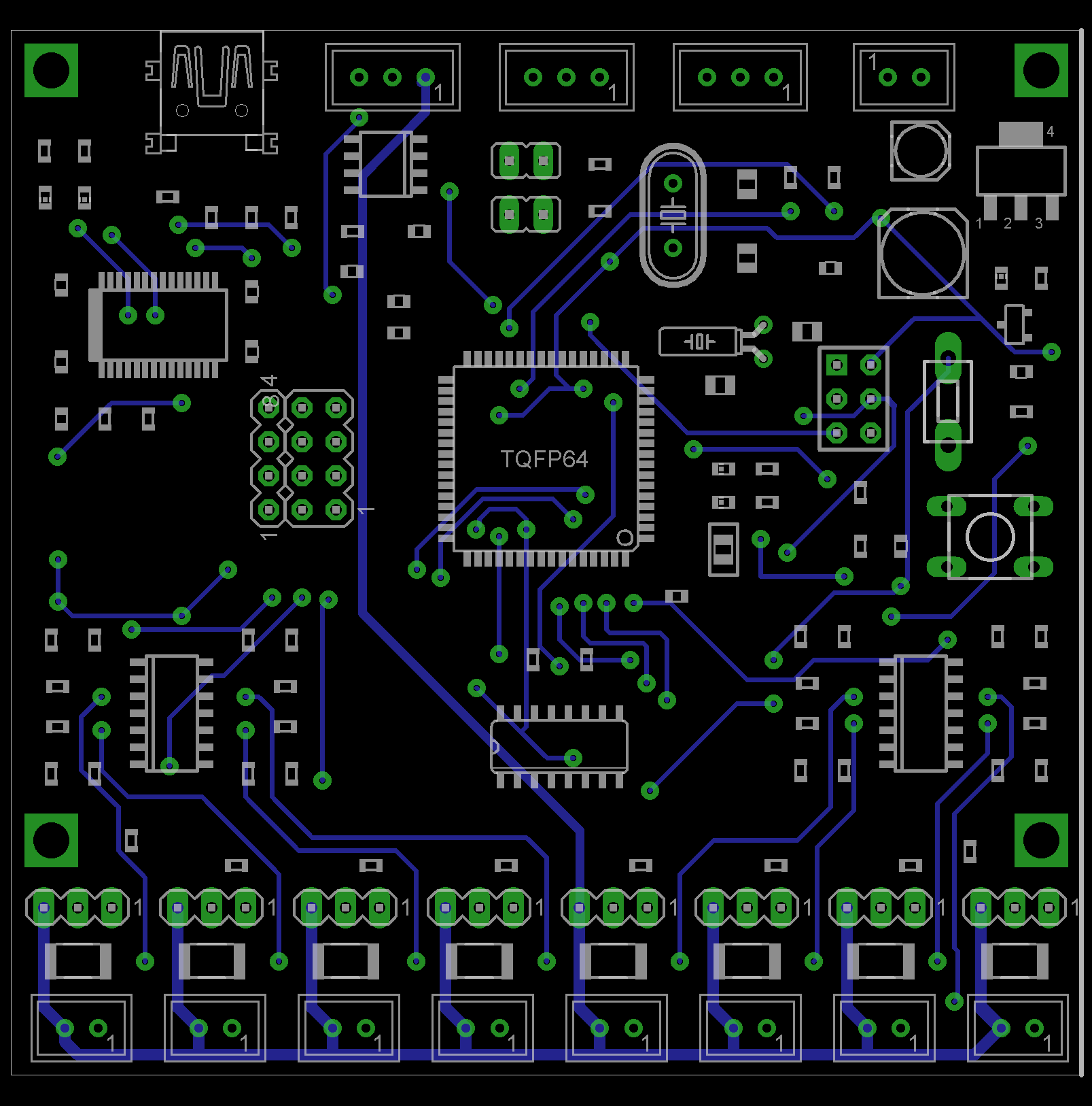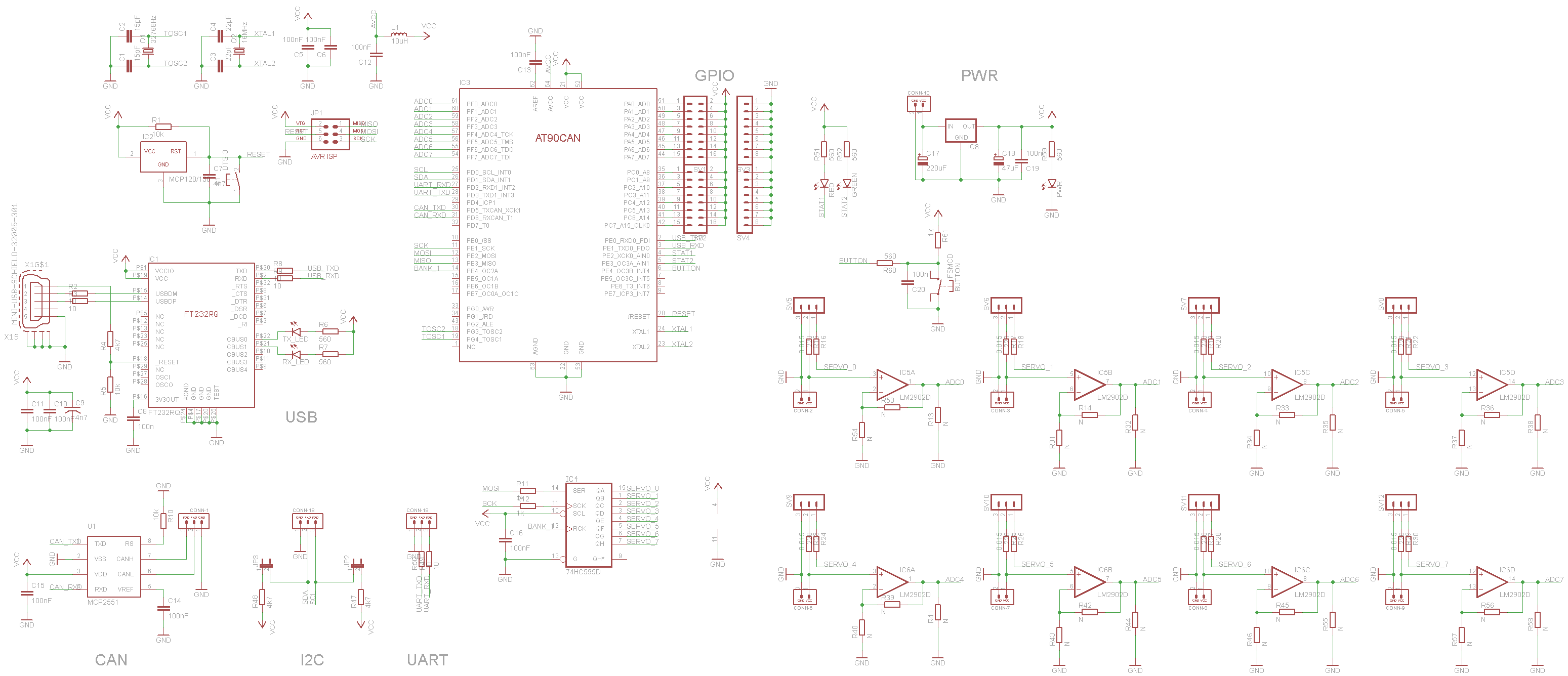 Получилось прикольно, для небольших стандартных\микро серв подходит отлично. Нужно только перенастроить датчик тока ( расчитать Ку ) для нормальной работы. Но я немного прогадал. Мне пришли сервы мощные, у них токи очень большие, поэтому нельзя включать их вместе в мой контроллер, тупо сгорят дорожки. Поэтому я решил сделать более "универсальную" и "заточенную" под мощные серво( да и не только под мощные, ведь даже в HS-311 ток прыгает до 1.5А ). Так как по работе, да и я, изучаю интерфейс CAN - то взял контроллер AT90CAN128. Собсно зачем я здесь это пишу - мне опять нужна Ваша помощь по проектированию схемы, а в дальнейшем может и ПП