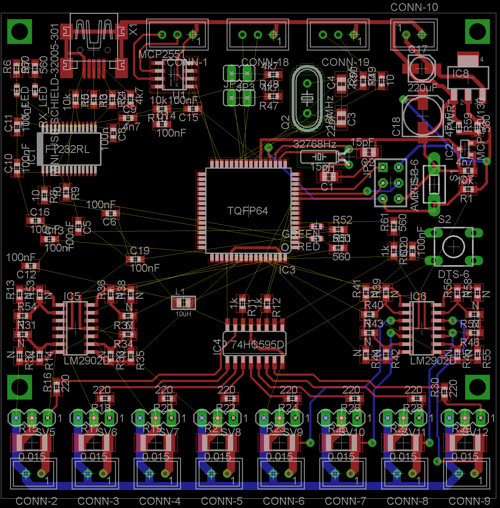 Получилось прикольно, для небольших стандартных\микро серв подходит отлично. Нужно только перенастроить датчик тока ( расчитать Ку ) для нормальной работы. Но я немного прогадал. Мне пришли сервы мощные, у них токи очень большие, поэтому нельзя включать их вместе в мой контроллер, тупо сгорят дорожки. Поэтому я решил сделать более "универсальную" и "заточенную" под мощные серво( да и не только под мощные, ведь даже в HS-311 ток прыгает до 1.5А ). Так как по работе, да и я, изучаю интерфейс CAN - то взял контроллер AT90CAN128. Собсно зачем я здесь это пишу - мне опять нужна Ваша помощь по проектированию схемы, а в дальнейшем может и ПП