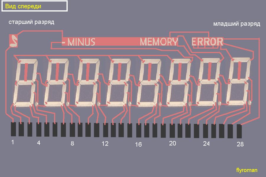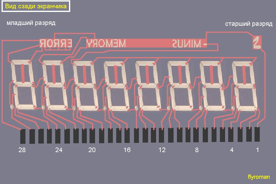 Что если включить калькулятор и например нажать цифру "1" и посмотреть на какие контакты микросхема калькулятора подает сигналы.