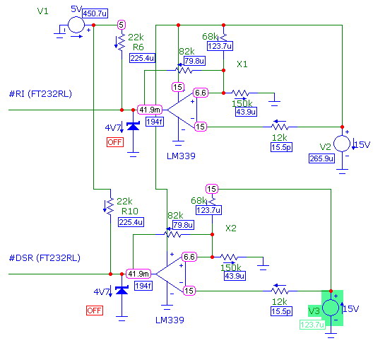 Надо организовать два таких канала. Т.е. Два входа 12-15Вольт и два выхода "0" или "1" (#DSR и #RI)