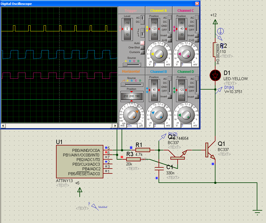 Схема будет использоваться для питания ИК-светодиода с частотой импульсов 36-38 кГц, при этом уровень импульсов регулируется от ~0.5В до ~11.4В с помощью ШИМ. В качестве ИК-светодиода TSAL5100. BC337 в схеме - в реальности BC817-40.