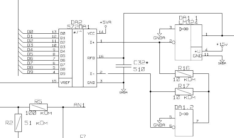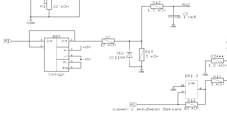 На рисунке выше приведена часть принципиальной схемы. AI - исходный сигнал, снимаемый с датчиков, с диапазоном принимаемых значений от -15 до +15 В. AN2 - представляющий интерес обработанный аналоговый сигнал, подключаемый непосредственно к АЦП МК.