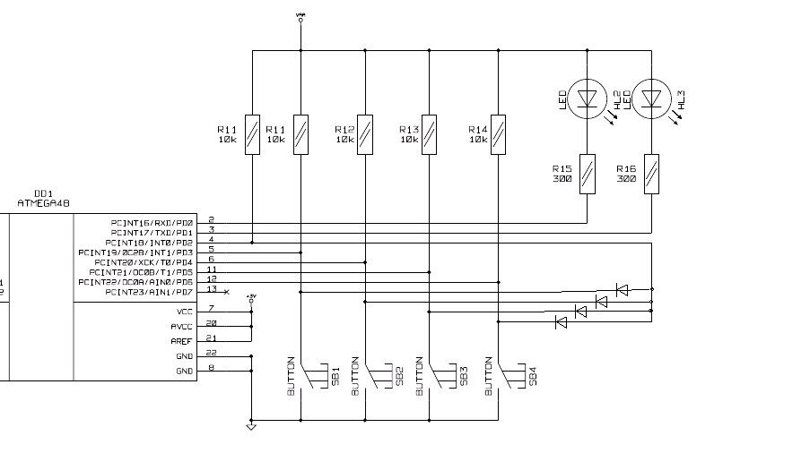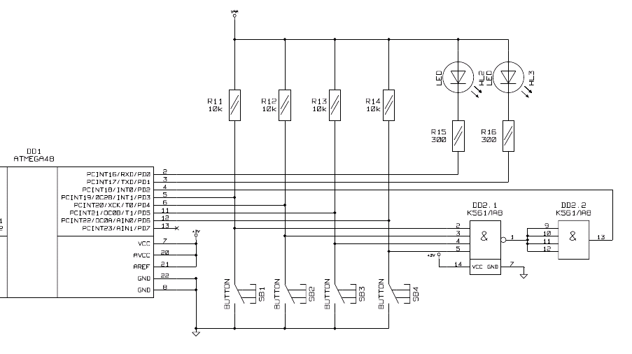 Задача заключается в следующем: для уменьшения энергопотребления при отсутствии активности усыплять (режим - powerdown) мегу48 со всей периферией. Пробуждение должно осуществляться при нажатии на одну из кнопок. Схемотехнически это выполнено так, как показано на рисунке ниже: