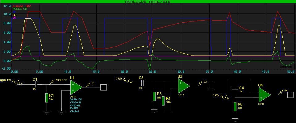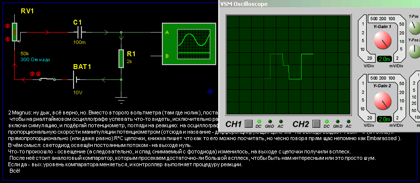 Outcaster писал(а):2 Magnus: ну дык, всё верно, но. Вместо второго вольтметра (там где нолик), поставь осциллограф, увеличь ёмкость и сопротивление (раз этак в 100, чтобы на риалтаймовом осциллографе успевать что-то видеть, исключительно ради эксперимента), включи симуляцию, и подёргай потенциометр, погляди на реакцию: на осциллографе увидишь кривульку, пропорциональную скорости манипуляции потенциометром (отсюда и название - дифференциирующая цепочка - на выходе выдаёт Vвых = k*(ΔVвх/Δt) k прямопропорционально (или даже равно) R*C цепочки, книжка пишет что как то его можно посчитать, но чесно говоря прям щас непомню как). В чём смысл: светодиод освещён постоянным потоком - на выходе нуль. Что-то произошло - освещение (а следовательно, и спад снимаемый с фотодиода) изменилось, на выходе с цепочки получили всплеск. После неё стоит аналоговый компаратор, которым просекаем достаточно-ли большой всплеск, чтобы быть нам интересным или это просто шум. Если да - вых.уровень компаратора меняеться, и контроллер выполняет процедуру реакции. Всё