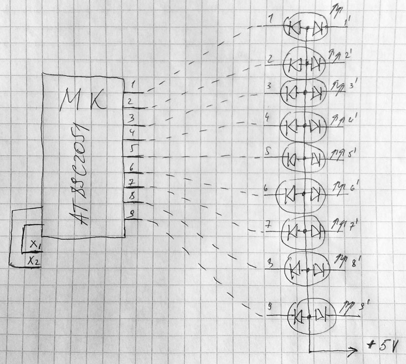 Да после долгих поисков, как вы "Radist" и говорили, необходимой микросхемы не было найдено. Поэтому возвращаюсь к предыдущей своей конструкции, но снова возникает один вопрос. Есть микроконтролер (AT89C2051) и двухцветные светодиоды (9 штук). На 4 порта мк подаю двоичный код (1-9) соответственно подается лог.0 на другие порты (загораются светодиоды). Но светодиоды у меня двухцветные с общим катодом. Каким образом мне можна с помощью ножек мк x1 и x2 управлять цветом всех светодиодов. Например, подаю на x1 лог.1, а на x2 лог.0, ну и на входы (на схеме не обозначены) 0110 (6) и получаю шесть зажженых светодиодов зеленого цвета. А когда меняю x1 лог.0, а на x2 лог.1, то ети же 6 светодиодов загораются красным цветом. Какую микросхему или что-то иное можно использовать?