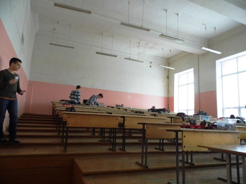 Дзюдо", со слов ребят, нас просто дисквалифицировали, т.к. роботы дружно выталкивали соперника и останавливались на черной черте, а по регламенту должна была оставаться подвижность, что подразумевало под собой корректировку программы, без компьютера сделать это невозможно. К тому же помещениями для проведения состязаний оказались обычные лекторные залы и классы, без единой розетки, соответственно нужен только свежий ноутбук способный держать заряд. Помещения на время проведения отбора и состязаний закрыли, доступ ограничили, остались лишь члены команды.