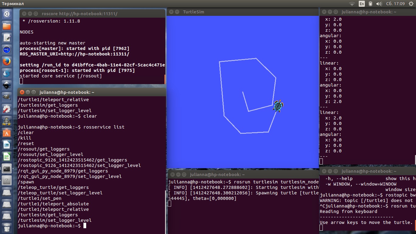 Эта команда отправляет единственное сообщение в turtlesim, в котором содержится информация о том, что необходимо двигаться с линейной скоростью равной 3.0 и угловой скоростью равной 2.0.