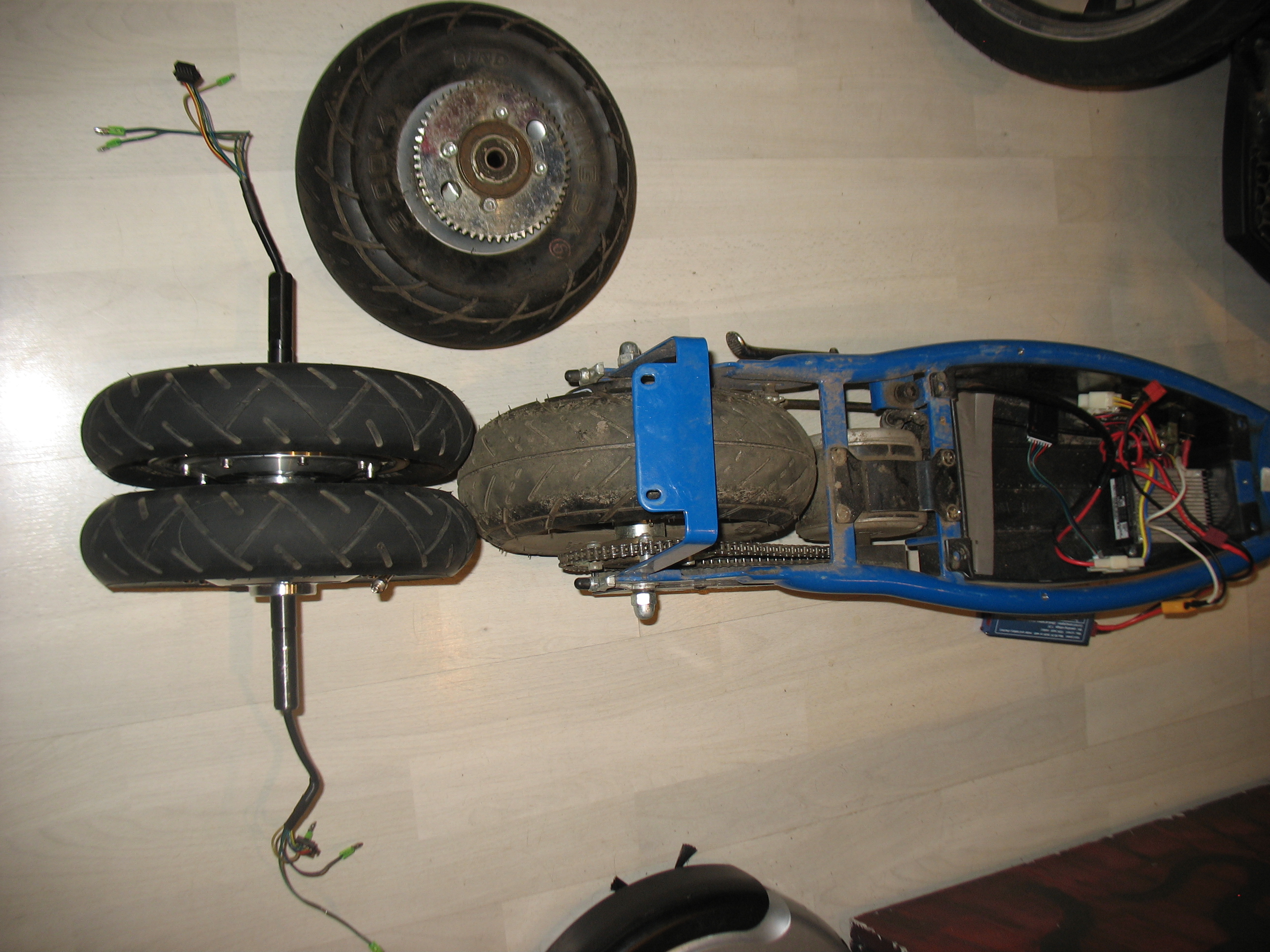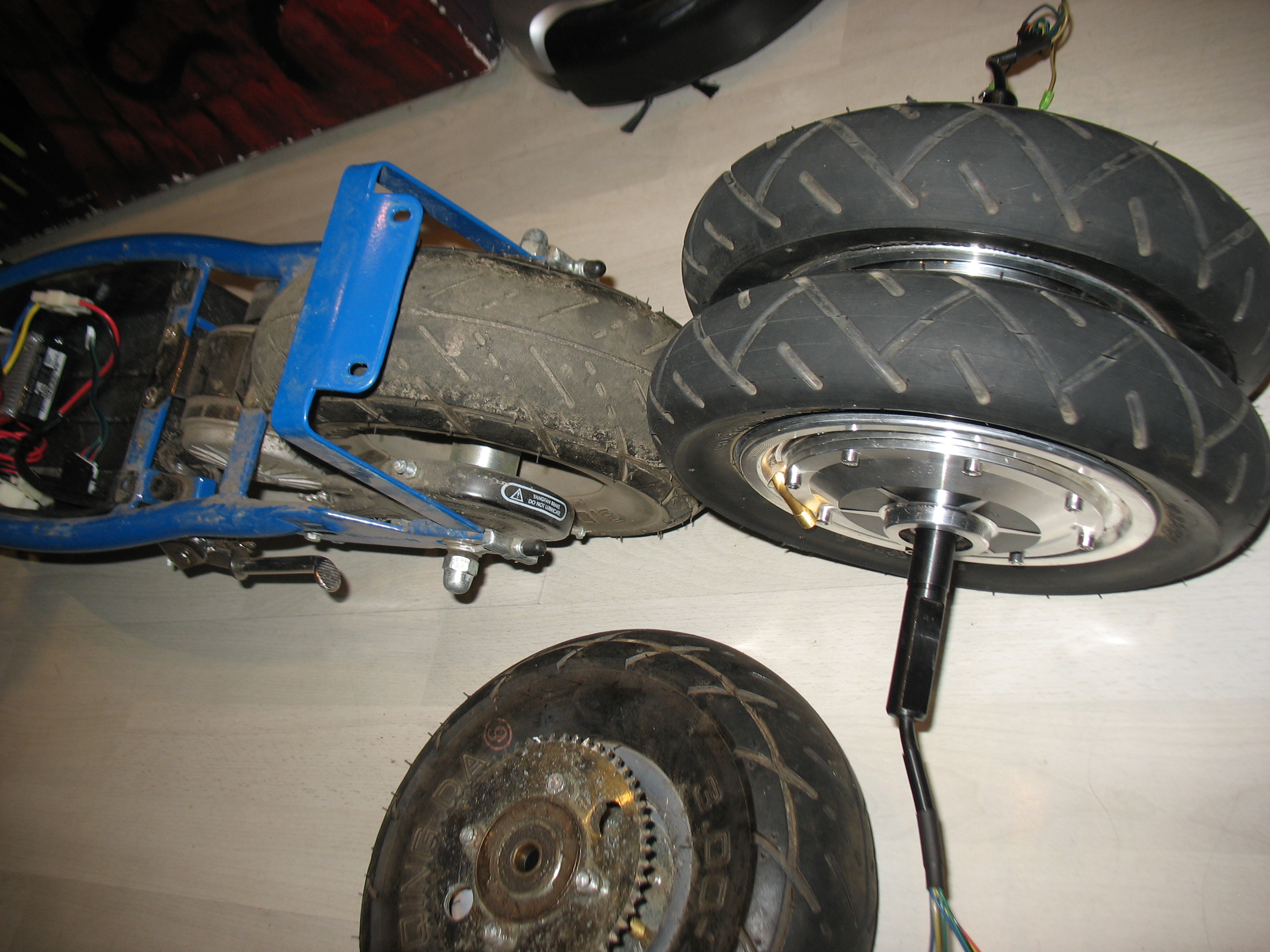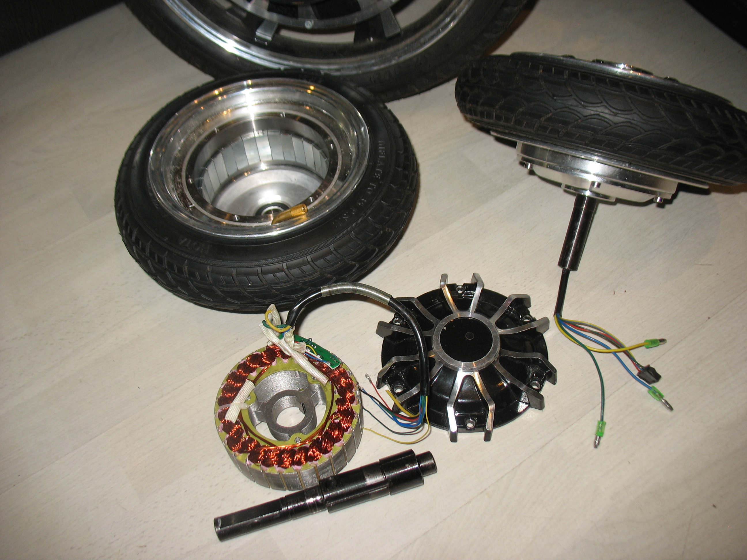 Полностью доделанная сторона, резьба резалась на токарнике. Провода все снял, пока работает как пустое 2-е колесо. Видно отверстие под будущую проводку, на конце вала - защитный колпачок, чтоб не убить провода при падании самоката.