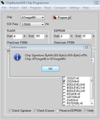 После года работы с этим программатором, вдруг проявилась такая ошибка (ниже) - программировал Atmega 48V. Раз 20 программировалась нормально (разными программами), потом случилось "это". Теперь ни этот МК, ни другая платка с Atmega32 не программируются. Питание на обох 3.4в. На 48й снизил питание до 3.2в (резистивным делителем - потребление вместе спрограмматором было 1мА)