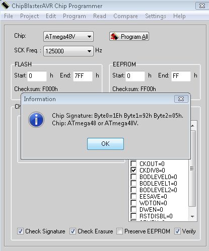 После года работы с этим программатором, вдруг проявилась такая ошибка (ниже) - программировал Atmega 48V. Раз 20 программировалась нормально (разными программами), потом случилось "это". Теперь ни этот МК, ни другая платка с Atmega32 не программируются. Питание на обох 3.4в. На 48й снизил питание до 3.2в (резистивным делителем - потребление вместе спрограмматором было 1мА)