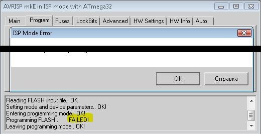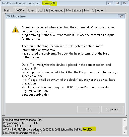 После года работы с этим программатором, вдруг проявилась такая ошибка (ниже) - программировал Atmega 48V. Раз 20 программировалась нормально (разными программами), потом случилось "это". Теперь ни этот МК, ни другая платка с Atmega32 не программируются. Питание на обох 3.4в. На 48й снизил питание до 3.2в (резистивным делителем - потребление вместе спрограмматором было 1мА)