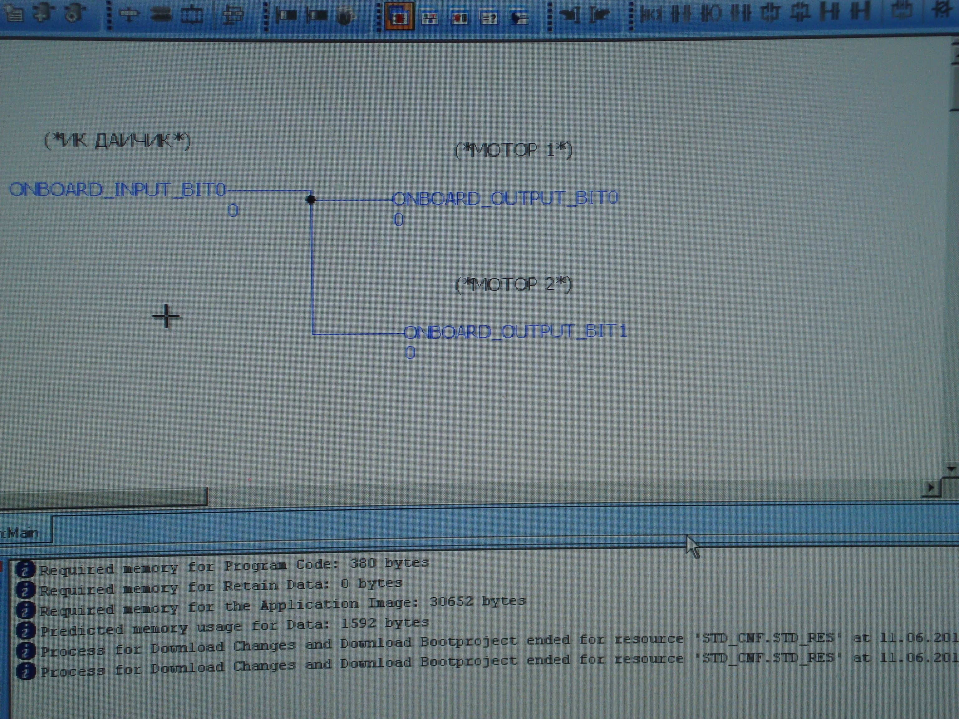 Добавлено спустя 24 минуты 41 секунду: Теперь что сделано за сегодня: в созданном проекте написана следующая програмка (полностью написанная подпрограмма управления двумя приводами, включающая повороты, реверсироваие - будет оформлена отдельным функциональным блоком) управлением приводами от ИК датчика: