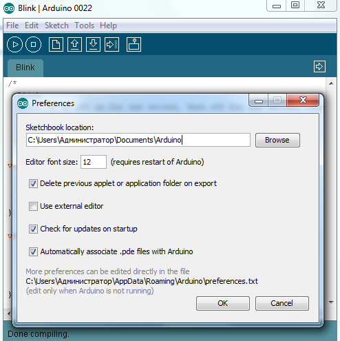 А в настройках Arduino указан путь к текстовому файлу в котором все настройки среды хранятся. C:\Users\Администратор\AppData\Roaming\Arduino