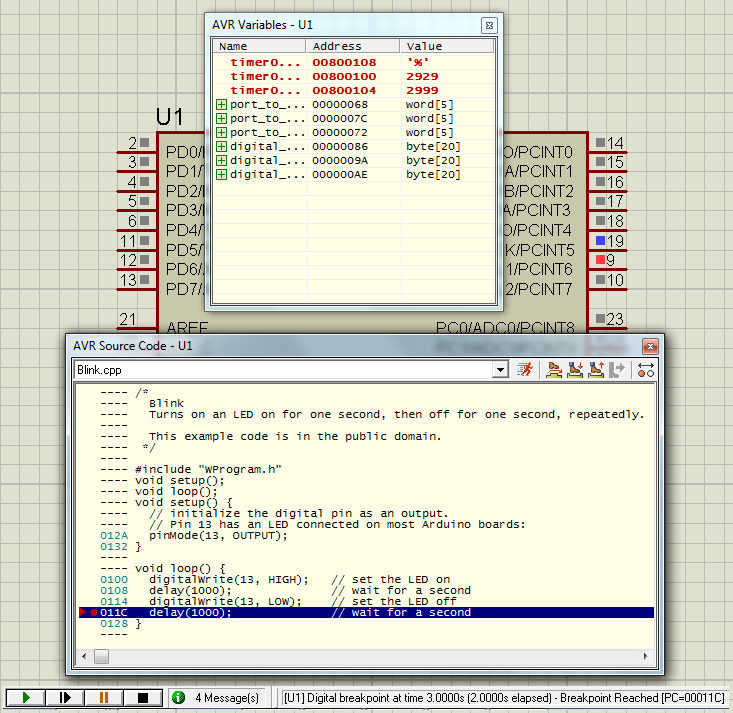УРА !!! РАБОТАЕТ !!! светодиод Arduino мигает в PROTEUS !!! Брэейкпоинты работают - точно 2 секунды, по исходнику движемся.