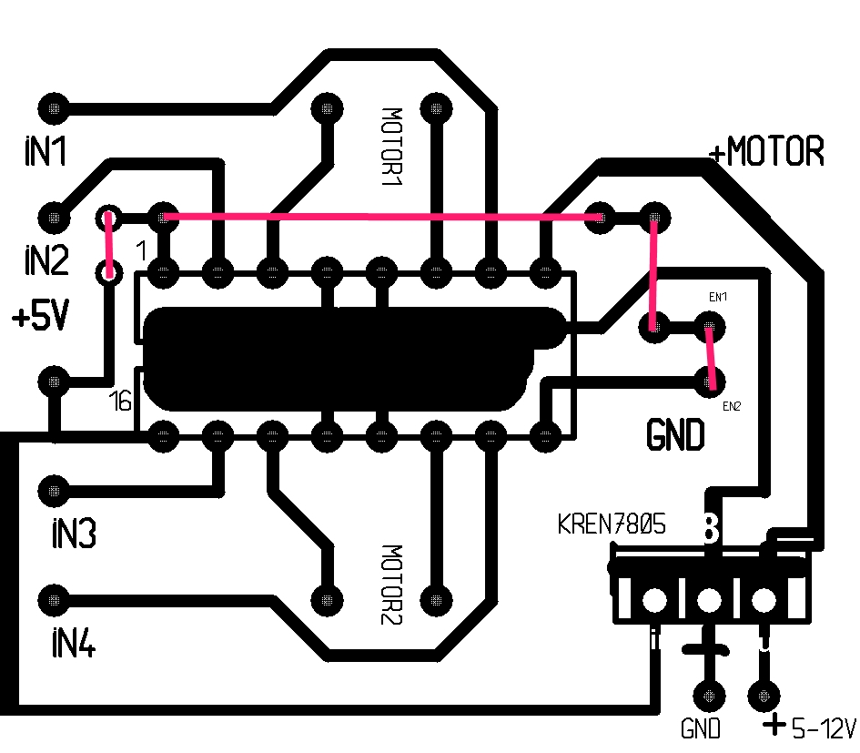 Добавлено спустя 10 минут 16 секунд: Т.к. питание не превышает 6в нужно проверить: соединены ли накоротко выводы L293 1,8,9,16. Дальше: т.к. питание не превышает 6в - выпаять нахрен 7805 (потому что она только! от 6,8в начинает стабилизировать) и подавать +питания на левый крайний пятачок где была 7805. Я ж говорил: если питание менее 6-ти вольт смысла в 7805 - нет. Если питание выше, тогда на моторы идет питание прямо от БП или акков, а навсю логику через 7805.