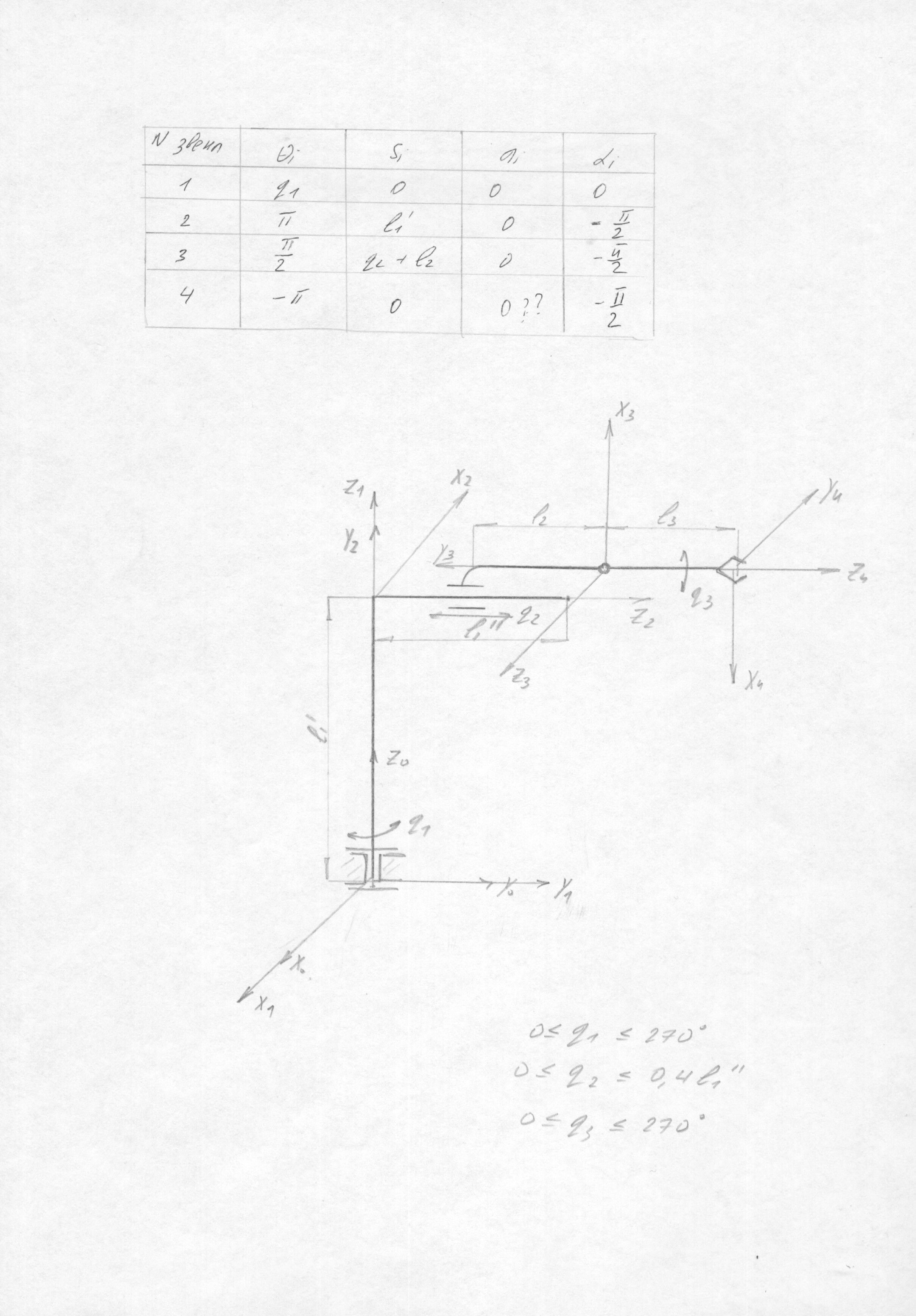 Такая проблема, делаю курсовую по дисциплине "Моделирование роботов". Пытаюсь решить прямую задачу кинематики. Вроде придерживаюсь правила Денавита-Хартенберга, но когда составляю матрицы Ai и перемножаю их, получается ерунда. Кто может указать на ошибку. Буду благодарен.