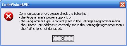 Вчера спаял программатор "5 проводков", провода от LPT вилки припаяны к гнезду для корпусов DIP 40. 4 провода Reset, MOSI, MISO, SCK подключены через резисторы на 100 Ом. Сажаю МК Atmega162 16PU в гнездо и подключаю к LPT порту на ПК - реакции нету, в диспетчер устройств он тоже никак ни отображается, так и должно быть? В CodeVisionAVR в programmer settings поставил настройки как на скриншоте 1, после зашел в Chip Programmer->Read и там считать фьюзы на что вылетело окно с ошибкой в скриншоте 2. В чём собственно может быть дело? LPT порт на компе работает! Или я ,что то не так делаю? И разве не надо на ножку Vcc МК подавать питание?
