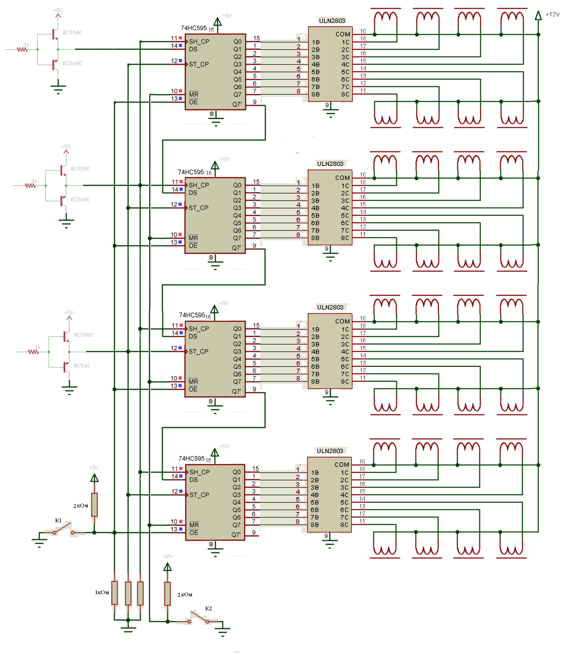 Zusul86 писал(а):Схему продлеваешь до нужного размера, плату лучше разбить на несколько сегментов и питание из одной точки подводить отдельно к каждому сегменту. При 12В питании соленоидов БП 250ВТ, можно попробовать меньшее напряжение если усилие не требуется. КРЕНку или еще чего то для получения 5В из 12В. По питанию каждого регистра керамику 100нФ. Возможно опторазвязку по входам поставить, что бы не жгло порты при подключении к компу. Землю и 12В к ULN2803 вести шиной 1мм2.