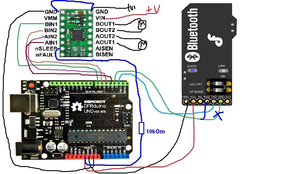Здравствуйте. Извините заранее, за возможно глупые вопросы и если здесь запрещены ссылки. Приобрел Arduino Uno, пару мотор редукторов, вот такой драйвер к ним http://www.robototehnika.ru/e-store/catalog/203/1176/ и блютуз-модуль http://www.robototehnika.ru/e-store/catalog/248/1059/ Как теперь это все соединить, что бы собрать колесного робота с управлением от андроид планшета? Хочу использовать приложение с сайта http://remotexy.com/ru/ Я нарисовал схемку подключения. Правильно или нет? Код останется таким же как и в этом примере? http://remotexy.com/ru/examples/car/ Помогите пожалуйста.