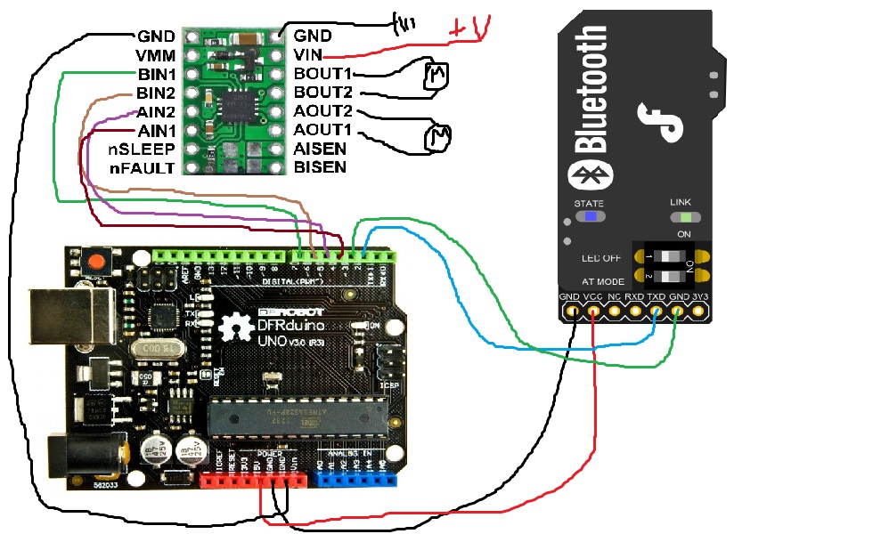 Здравствуйте. Извините заранее, за возможно глупые вопросы и если здесь запрещены ссылки. Приобрел Arduino Uno, пару мотор редукторов, вот такой драйвер к ним http://www.robototehnika.ru/e-store/catalog/203/1176/ и блютуз-модуль http://www.robototehnika.ru/e-store/catalog/248/1059/ Как теперь это все соединить, что бы собрать колесного робота с управлением от андроид планшета? Хочу использовать приложение с сайта http://remotexy.com/ru/ Я нарисовал схемку подключения. Правильно или нет? Код останется таким же как и в этом примере? http://remotexy.com/ru/examples/car/ Помогите пожалуйста.