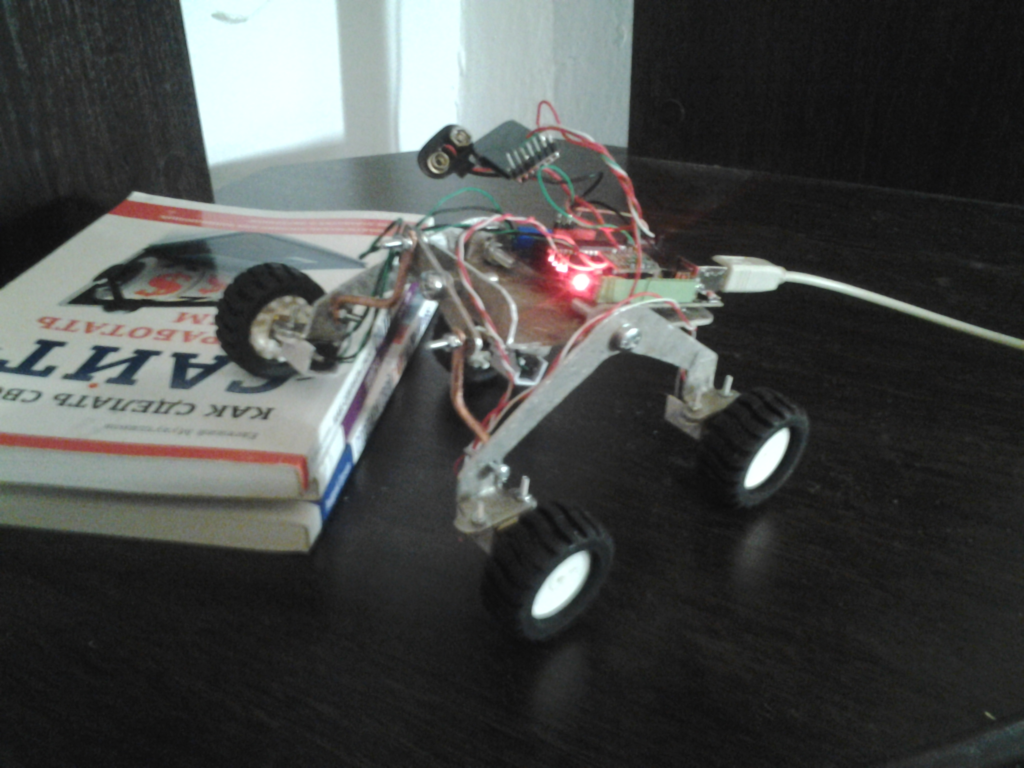 Правда работает только при питании от компьютера. В качестве мобильного источника питания я использовал крону, но ее видимо мало, моторы вроде щелкают но не крутят, хотя ардуино вроде бы реагирует на сигналы управления.