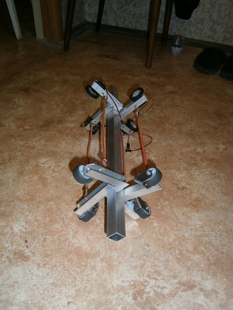 Имеющихся камер у меня ровно ноль. Подбираю её потому, что заказывать буду на aliexpress, а с остальным уже сейчас могу экспериментировать. К тому же от камеры зависит во многом и остальная структура. Ходовая на фото (игра: дорисуй шесть колёс). Не спрашивайте, зачем так длинно, отпилить всегда можно. Передние и задние ноги стянутся пружинкой/резинкой попарно (см. картинку на предыдущей странице) так, чтобы колёса стремились максимально отойти от оси трубы. Мозги - STM8. Каналом управления предполагается сделать WiFi. Сегодня купил-таки ESP201. Буду пытаться включить мотор командой с компьютера. Если получится, то с компоновкой более-менее ясно (позже распишу и разрисую подробнее, если есть необходимость).