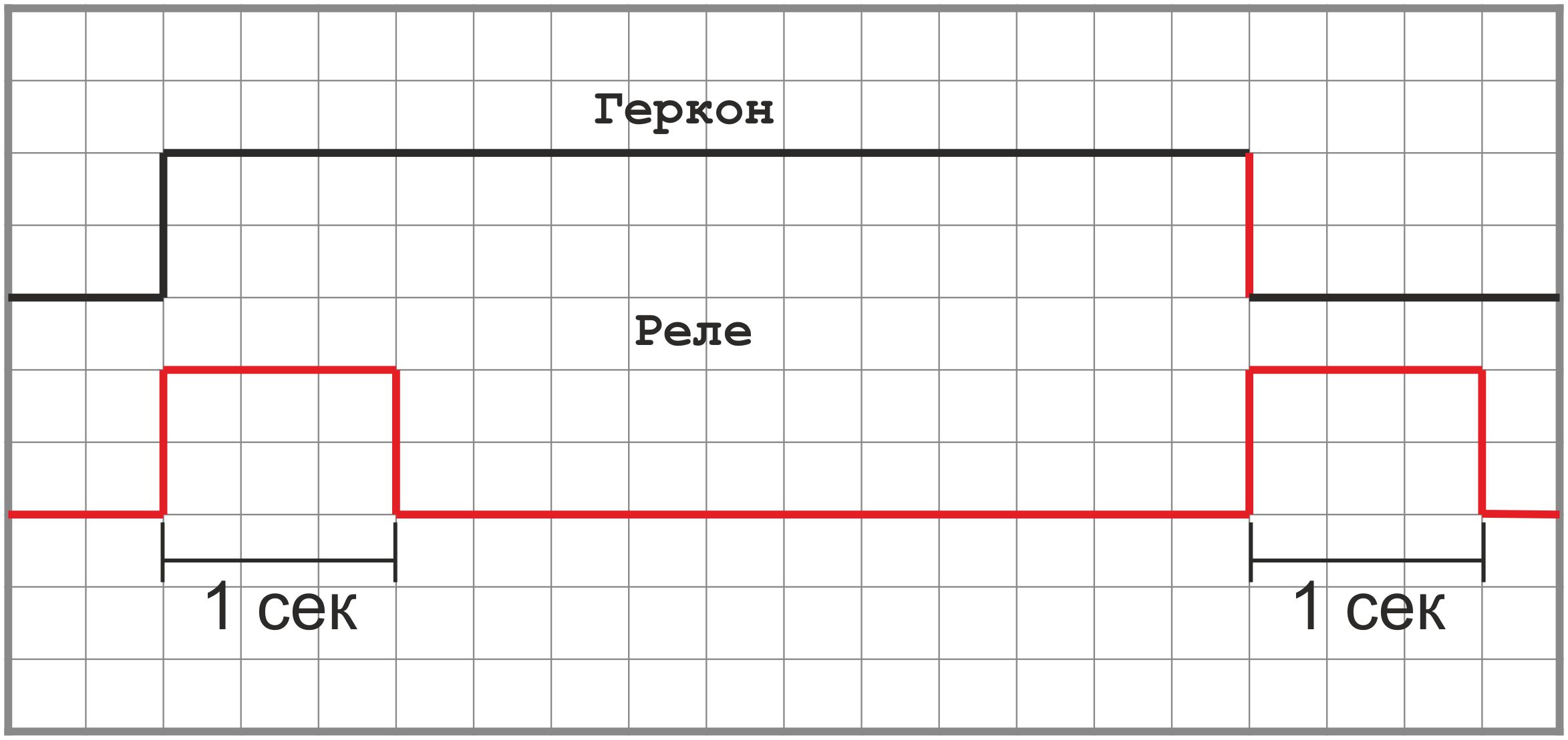 Мой ответ - это не схема, скорее общие рассуждения, которые возможно помогут вам. Геркон (в общем случае ключ) через резистор подтягиваем к источнику питания (постоянное напряжение). Нас интересует место соединения геркона и резистора. Когда ключ замкнут - напряжение в этой точке равно нулю, когда разомкнут - напряжению питания. Если сюда включить осциллограф и будем замыкать/размыкать ключ - увидим переходы напряжения с отвесными фронтами, можно назвать их прямоугольными импульсами. Затем к этой точке подключаем дифференцирующую RC цепочку (то есть конденсатор последовательно, резистор параллельно). Такая цепочка на переход из нуля в единицу (напряжение питания) реагирует появлением на резисторе короткого импульса положительной полярности, а на переход из единицы в ноль - появлением короткого импульса отрицательной полярности. Нас интересуют оба импульса, но надо чтоб они были положительной полярности (или придумать способ включения реле от импульса отрицательной и положительной полярности). Я сейчас не рассматриваю все возможные решения, а только простое, первое пришедшее на ум. Чтоб полярность была только положительной - надо выпрямить сигнал (как это мы делаем в источниках питания с синусоидой). Эту задачу решает диодный мост. В итоге имеем короткий импульс включения и короткий импульс выключения положительной полярности. А надо чтобы импульсы были длиной 1 секунда. Эту задачу решает одновибратор - устройство, формирующее импульс заданной длины по запускающему сигналу. Полученный импульс отправляем на базу транзистора, в цепь коллектора которого включено реле (обязательно обмотку реле зашунтировать диодом). Вот и все, задача решена, если я правильно понял условия. Для того, чтобы нарисовать схему по моему описанию - я дал достаточно ключевых фраз для гугля. Затем эту схему можно будет отмоделировать в любом понравившемся симуляторе, и если все работает как надо - спаять.