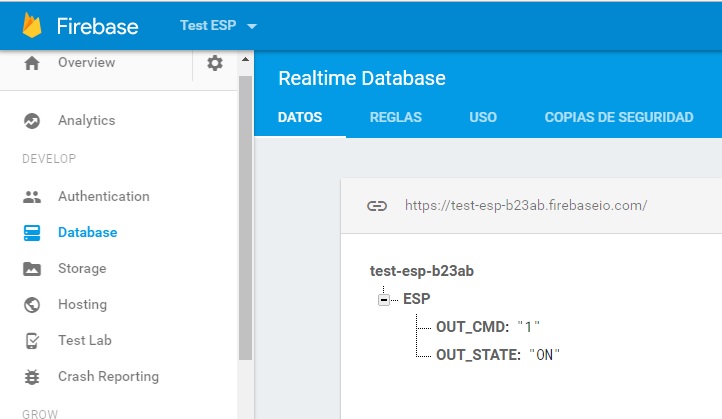 2.3 Билдим, ставим на смарт. Нажимаем кнопку ON и смотрим на нашу консоль, отображающую, состояние БД. Ага! Появилась папка ESP, а в ней новая запись OUT_CMD: "1".