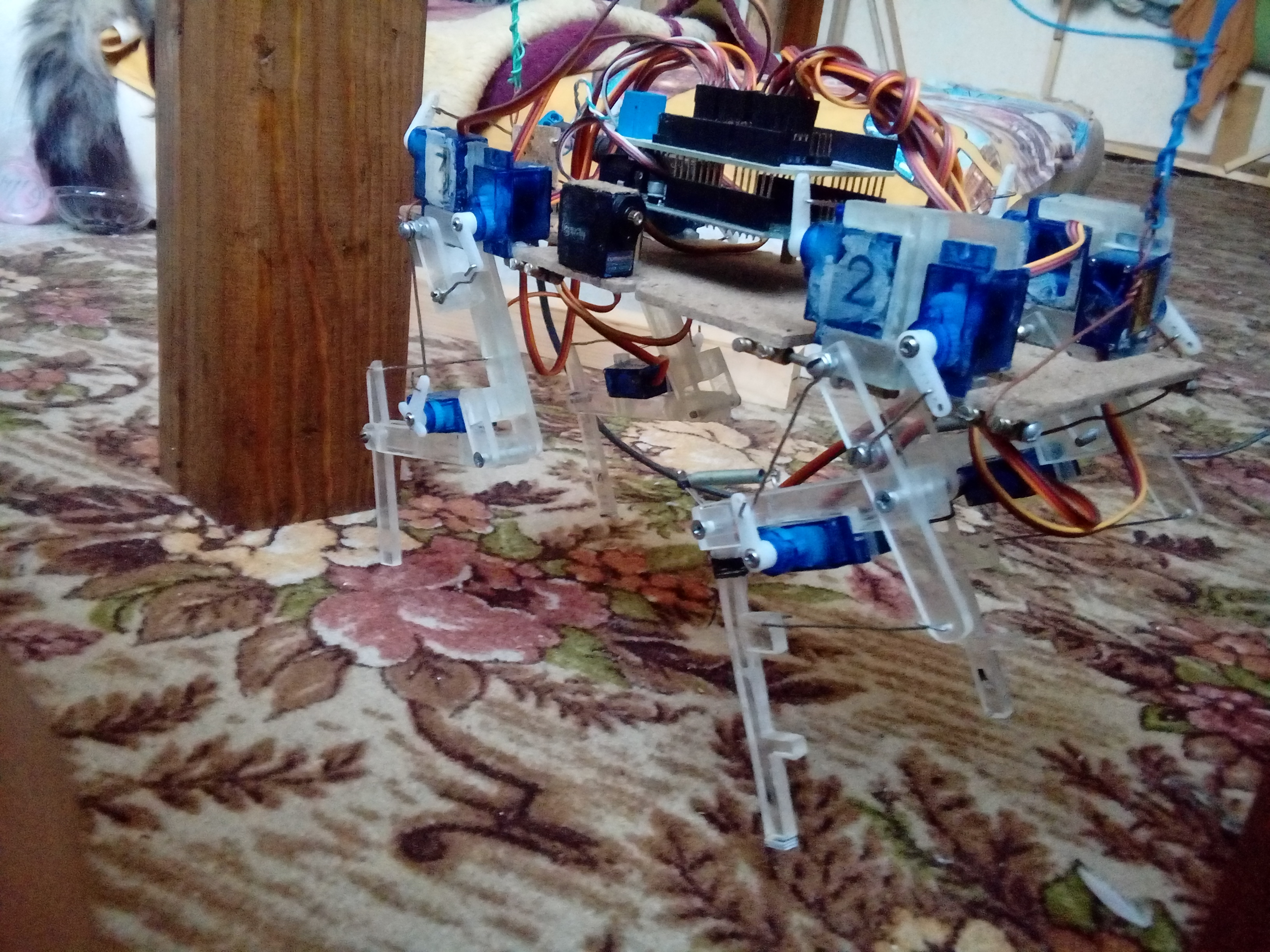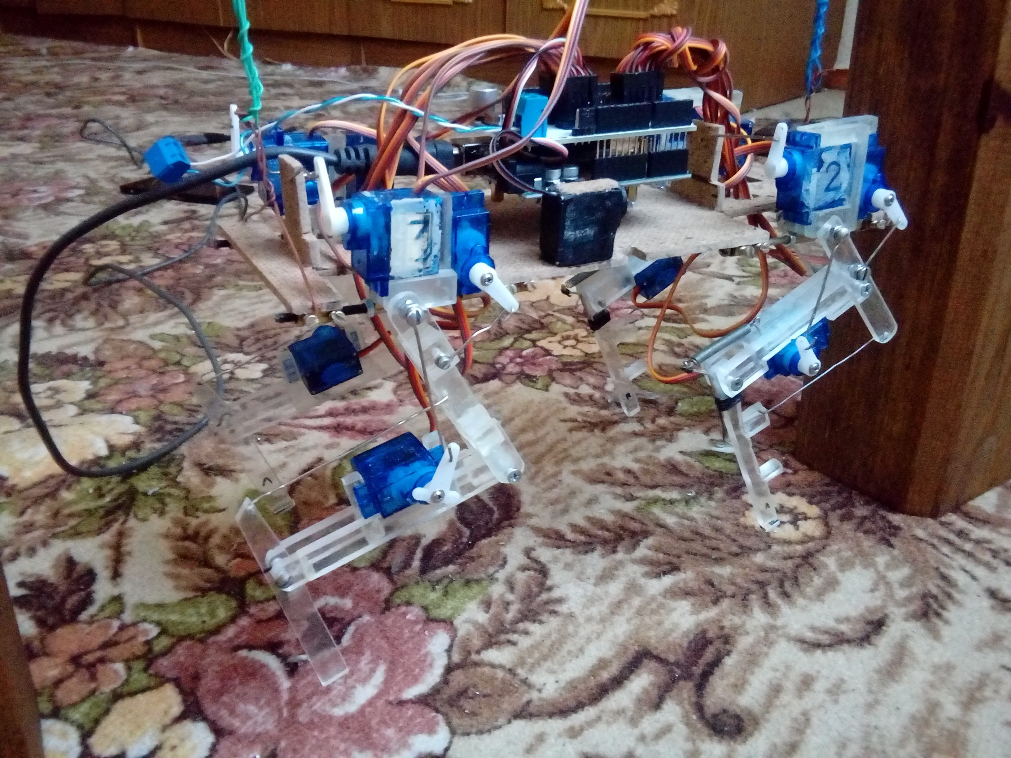 http://www.robotshop.com/letsmakerobots/quadУ него шаги осуществляются как вы видите: задняя правая, передняя поавая, потом левая сторона, а у меня крест на крест. То есть передняя правая-задняя левая, передряя левая-задняя правая