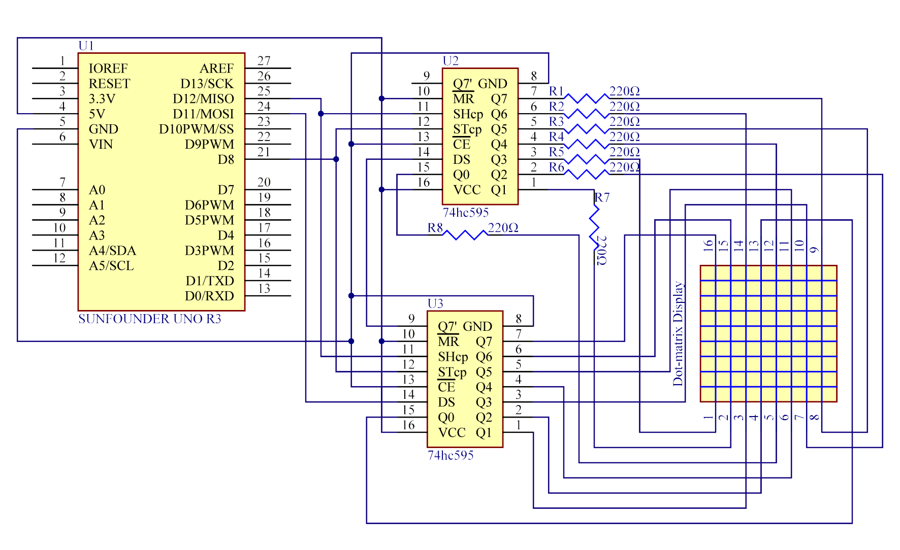 собрал для практики светодиодную матрицу 8х8 на регистрах 74сн595, то есть на катодах и анодах по регистру.