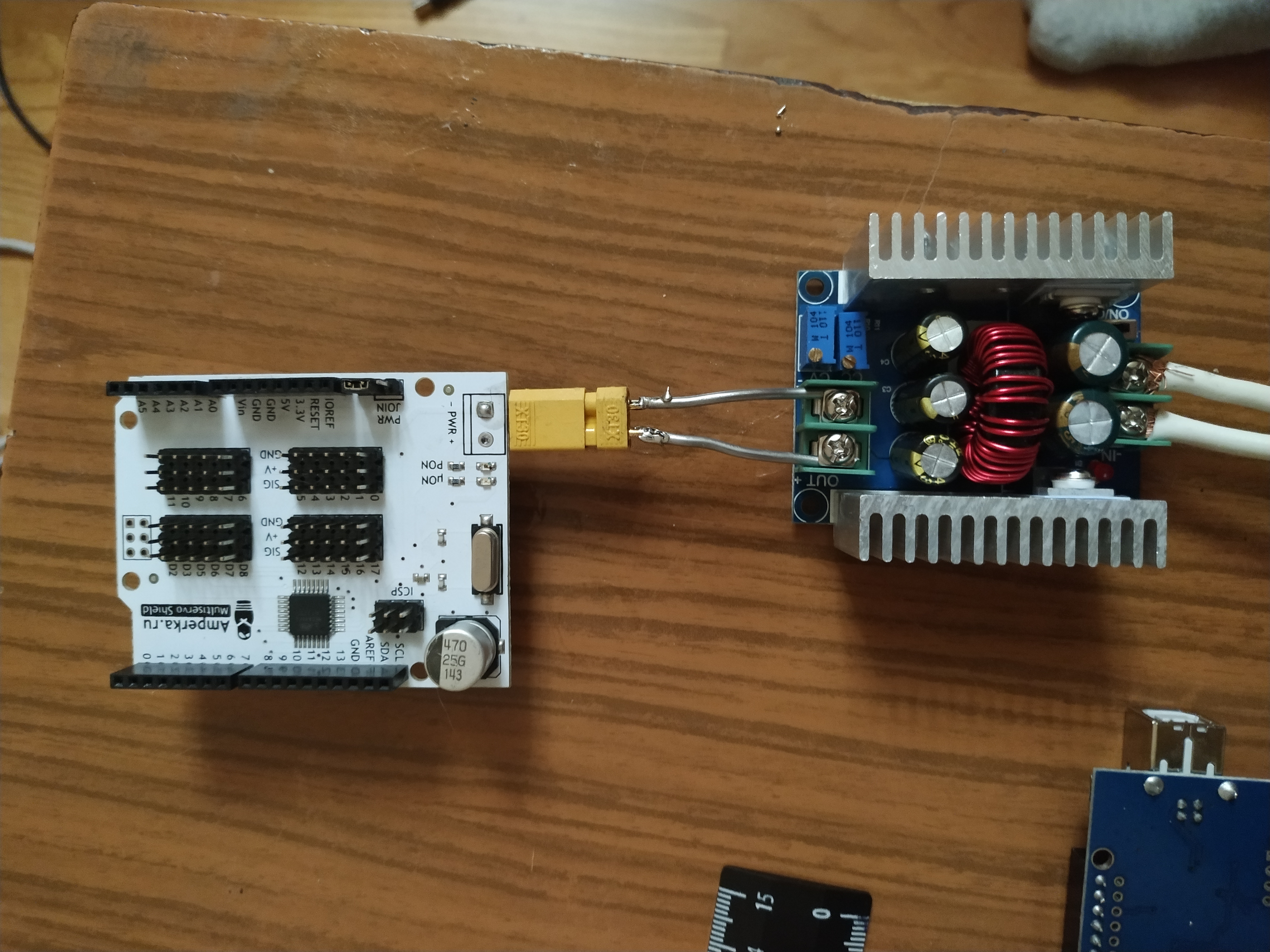В общем Китай совсем плохой стал, самое главное, в виде преобращоыателя, все никак не доедет в наши края. Я за это время уже успел купить и собрать 3д принтер. И тут немного прояснилось с питанием... Преобразователь идет на 20А, хорошо, это для 8ми двигателей, которые, как мы выяснили будут втыкаться в серво шилд с увеличенными дорожками питания. А вот остальные 4 сервы.. Нашел я и купил 4 мааленьких преобразователя, на 3А в пике, этого хватит, по 1 на каждый двигатель. Но тогда выходит, что этих 4х мне придется питать не от шилда, а отдельно от маленьких DC/dc а сигнал брать с шилда. В общем путаница и проводная паутина. В связи с этим встал вопрос, не перепаивать дорожки питания шилда, а использовать его только для сигнала двигателей. А для питания, создать отдельную схему, для всех 12ти. Но опять же огромный бутерброд получается.. Сервошилд, размером с уно, который втыкается в саму уно и сверху или же снизу еще схема разведки питания.